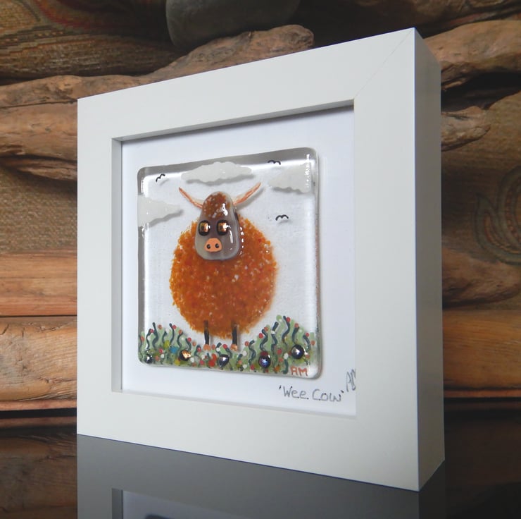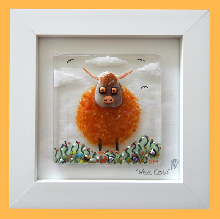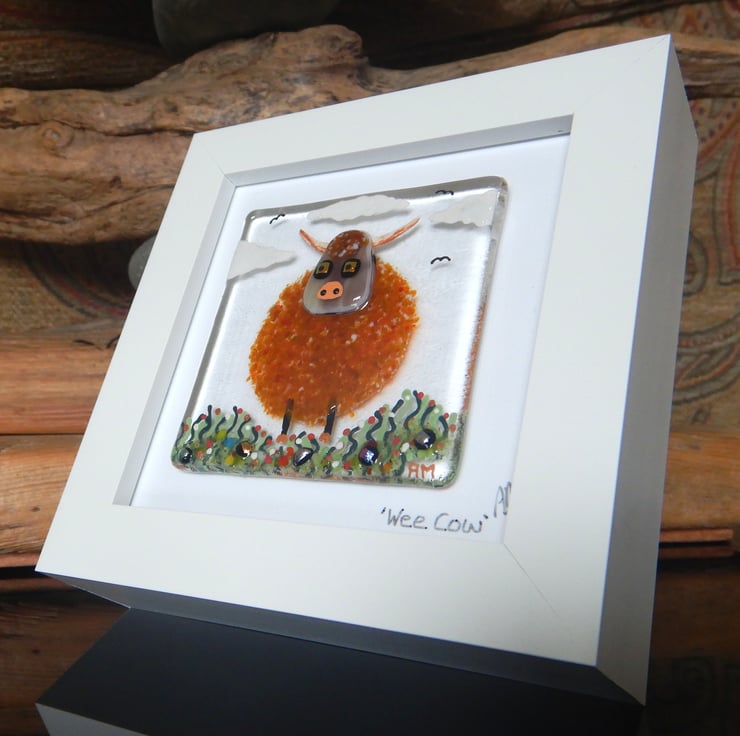 'Cow' is made completely from glass which has been fused in my kiln. There is no enamel, glass paint or any other materials used, this picture is 100% pure bullseye fusing glass!
