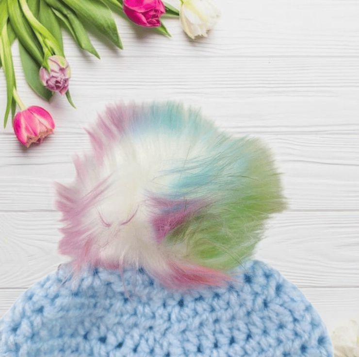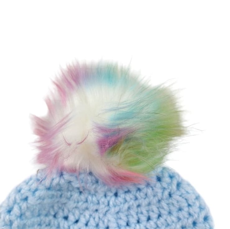 The hat comes with a detachable faux fur pompom, enhancing its charm. The pompom is white with delightful green, blue, pink, and purple tips, making it a colorful and fun accessory. It is attached via an elastic loop that easily fastens onto a button inside the hat, allowing for convenient removal and attachment.