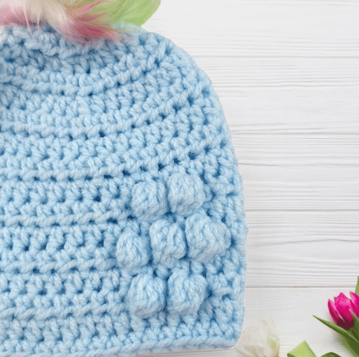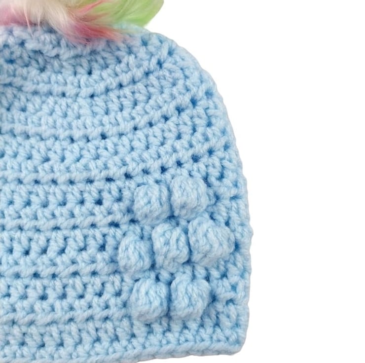 Handcrafted with care using aran weight pale blue yarn, this baby hat is designed to offer warmth and comfort. The hat features a delightful bobbly puff flower on the front left side, adding a playful and adorable touch.
