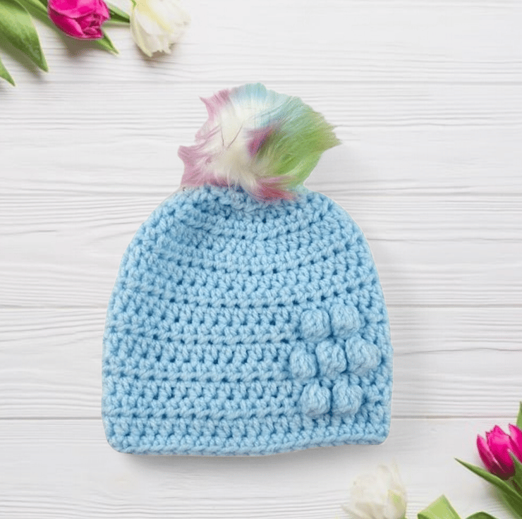 Blue Baby Crocheted Hat with Flower Detail and Detachable Faux Fur Pompoms, a charming accessory to keep your little one snug and stylish on every outing.