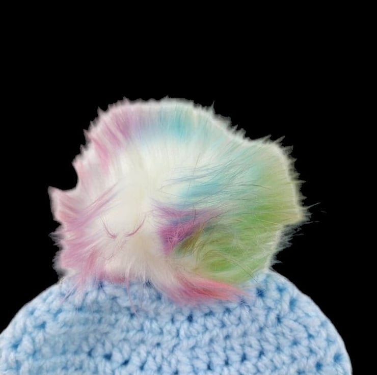 The hat comes with a detachable faux fur pompom, enhancing its charm. The pompom is white with delightful green, blue, pink, and purple tips, making it a colorful and fun accessory. It is attached via an elastic loop that easily fastens onto a button inside the hat, allowing for convenient removal and attachment.