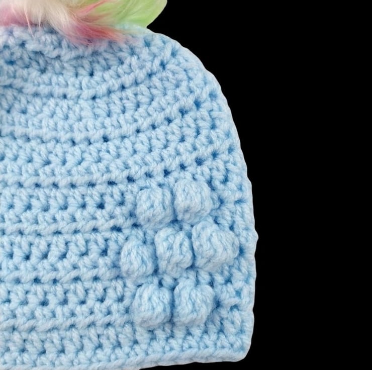 Handcrafted with care using aran weight pale blue yarn, this baby hat is designed to offer warmth and comfort. The hat features a delightful bobbly puff flower on the front left side, adding a playful and adorable touch.