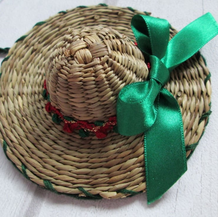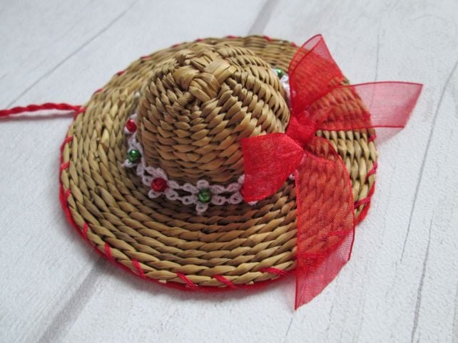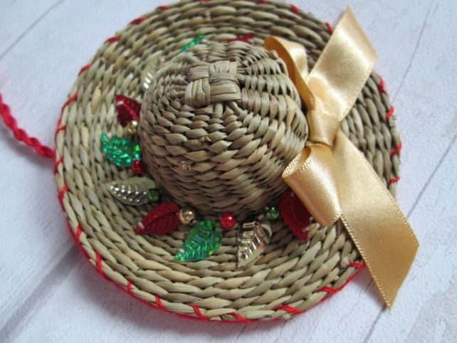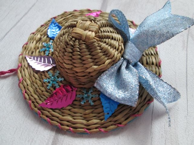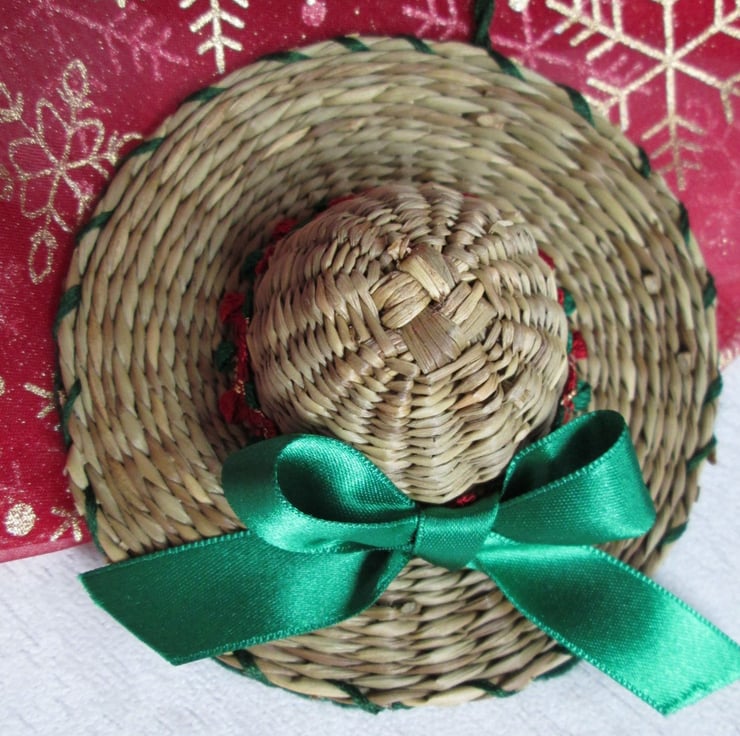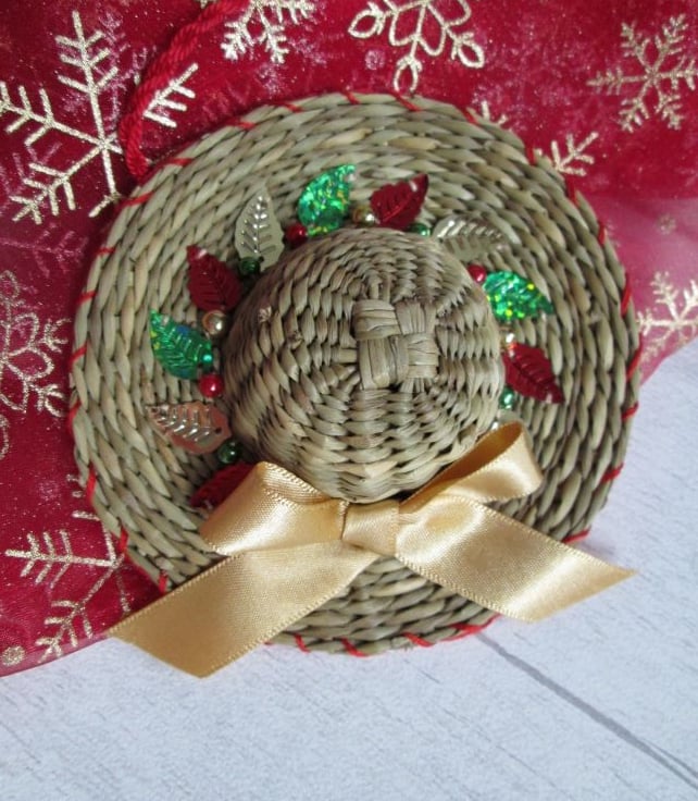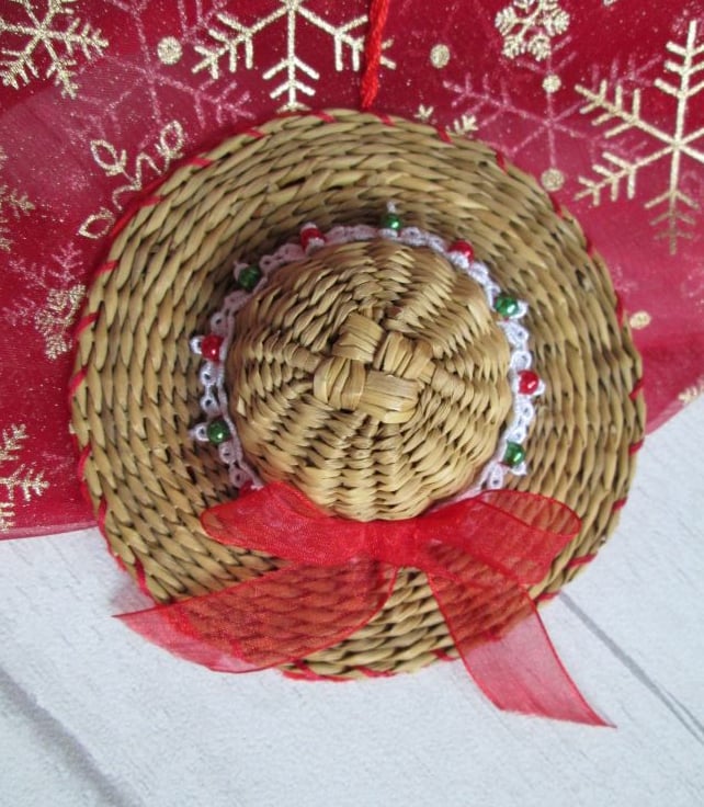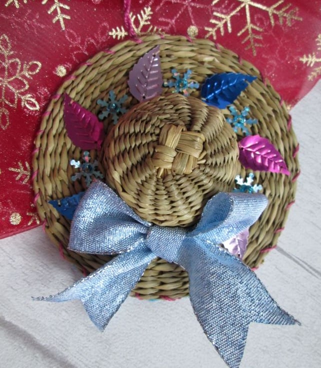 Four, one-of-a-kind, Christmas decorations in the shape of little straw hats decorated with ribbon, braid, beads and sequins. Each measures approximately 10 cm in diameter and is finished with a felt backing and twisted embroidery thread hanging loop. This set comprises three hats in traditional colours and one in frosty blues and pinks