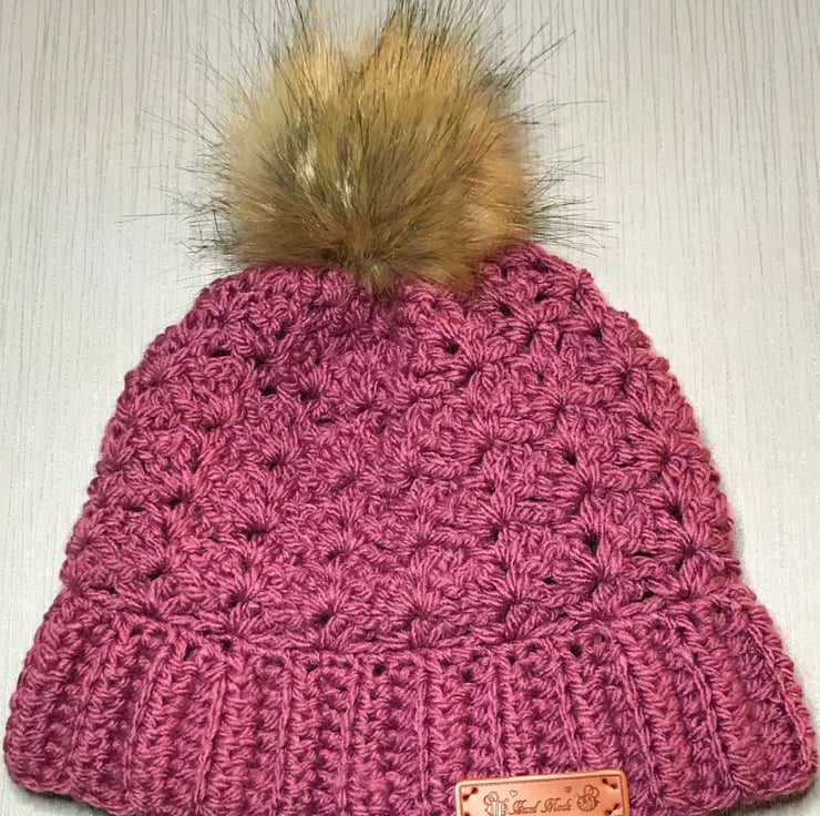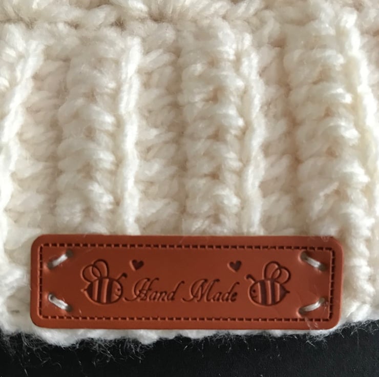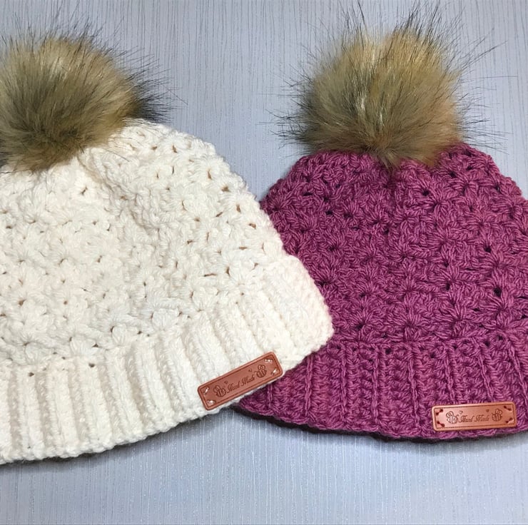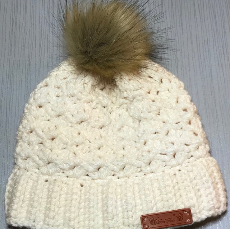 Each hat comes complete with a faux fur pom pom and leather tag, saying "handmade".
