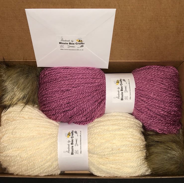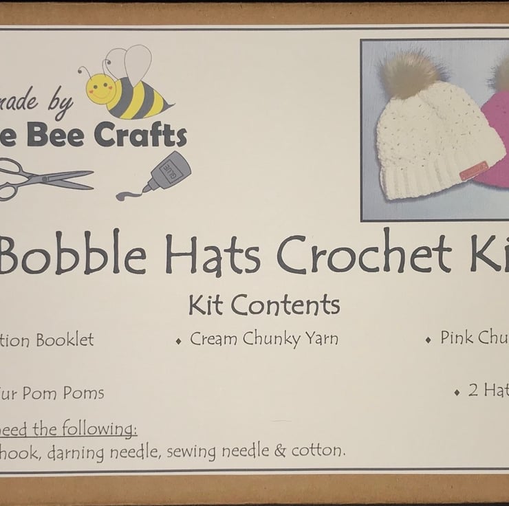 This is a kit, suitable for beginner crocheters, which will enable you to make two beautiful bobble hats - one in cream and one in dusky pink. Make one for yourself and gift one to a friend!