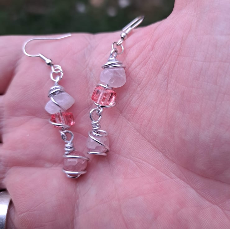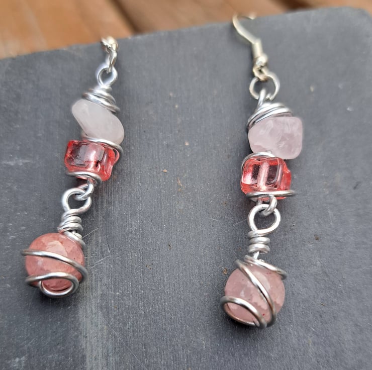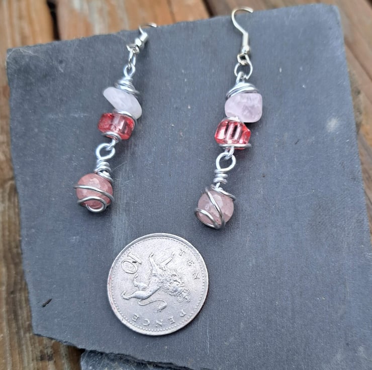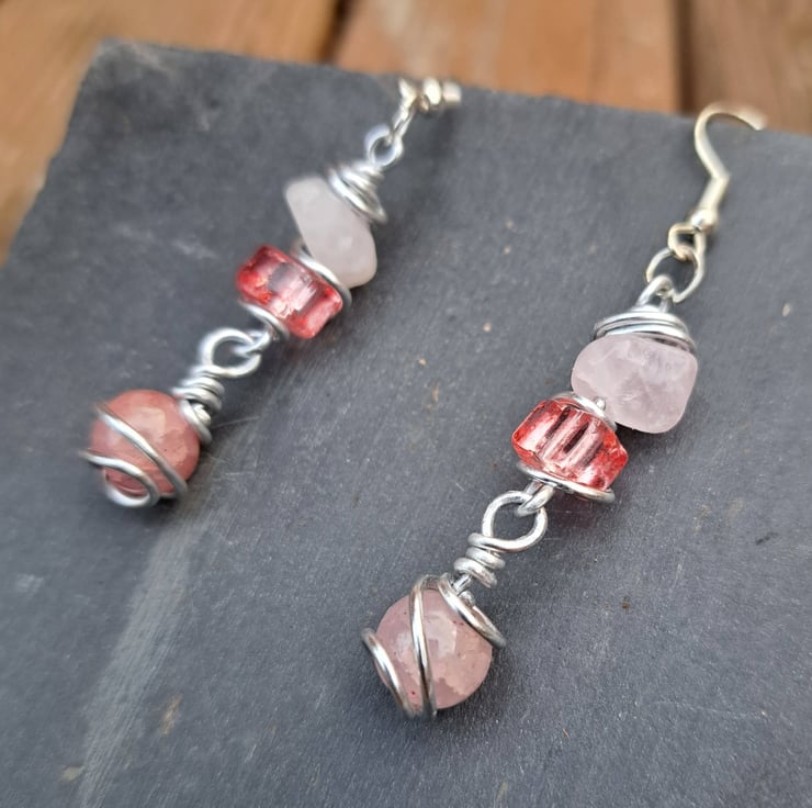 These wire-wrapped dangle earrings with nickel-free ear hooks feature rose quartz and cherry quartz crystal chip beads, with an 8mm rose quartz bead dangling at the bottom. Elegant and versatile, they add a touch of natural beauty to any outfit.