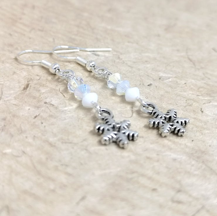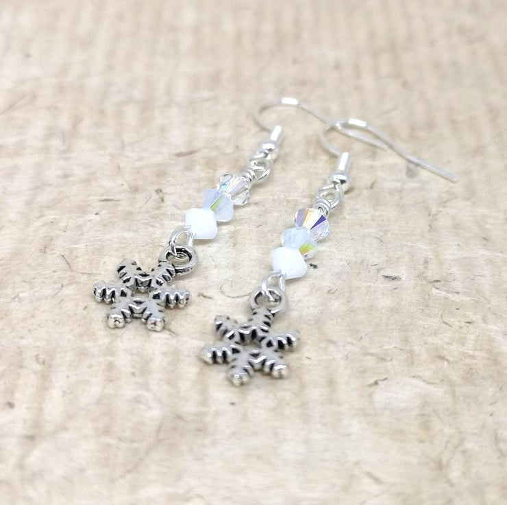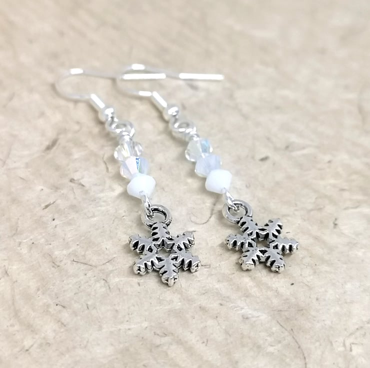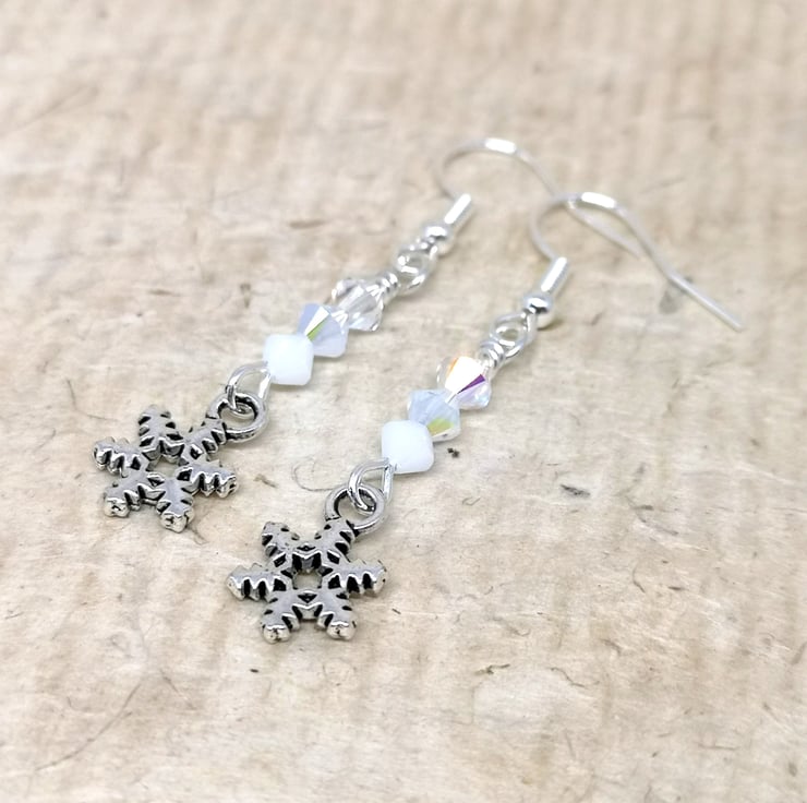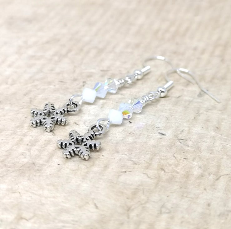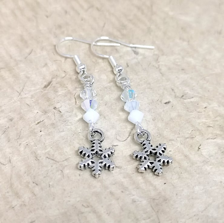 These festive earrings feature a trio of super sparkly Swarovski crystals. Beneath them sits a sweet little snowflake charm. They've been attached to silver plated ear wires.