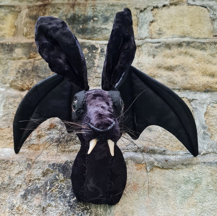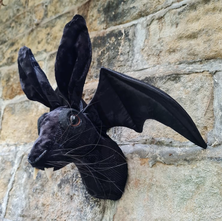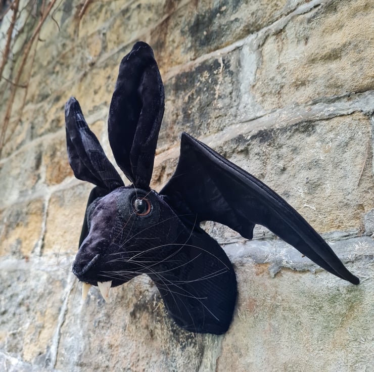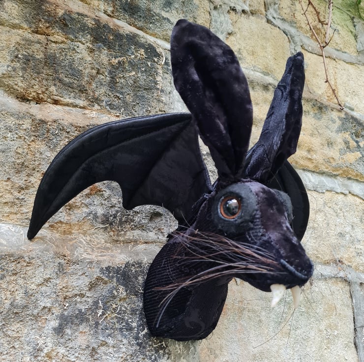 A lifesize textile hare head which I have hand stitched with black flock velvet fabric. He has hand sculpted and cast vampire fangs and gorgeous shiny black bat wings.