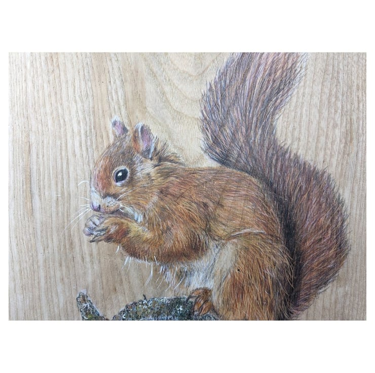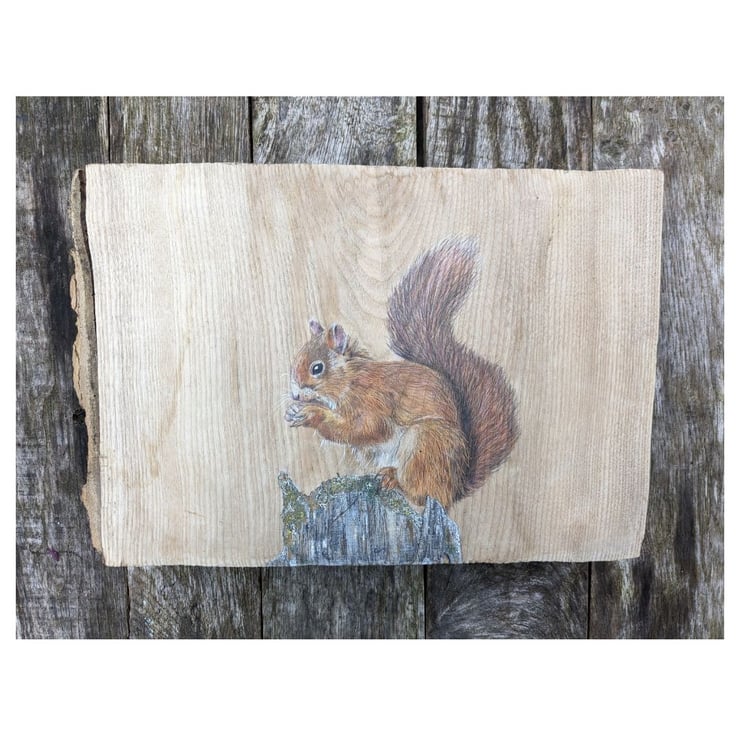 'Mr Red' is a beautiful squirrel created using watercolour paint, watercolour pencils and polychromo pencils on a big, chunky piece of reclaimed wood measuring approximately 38x26cm with a width of 5cm.