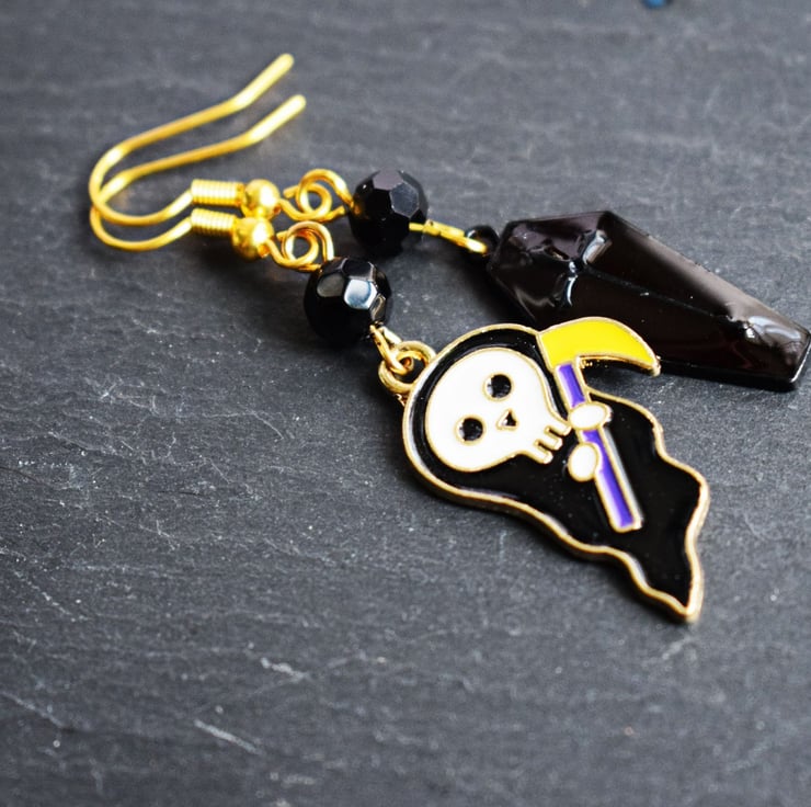 The grim reaper and coffin charms are finished with black faceted glass beads and hung from gold plated earwires. They are just over 2 inches long or around 5.5cm and are lightweight and comfortable to wear. Great as a finishing touch for Halloween maybe but just as good for horror lovers, goths and emo's all year round!
