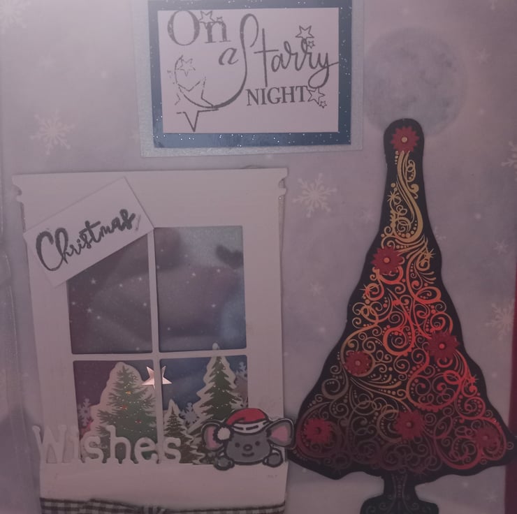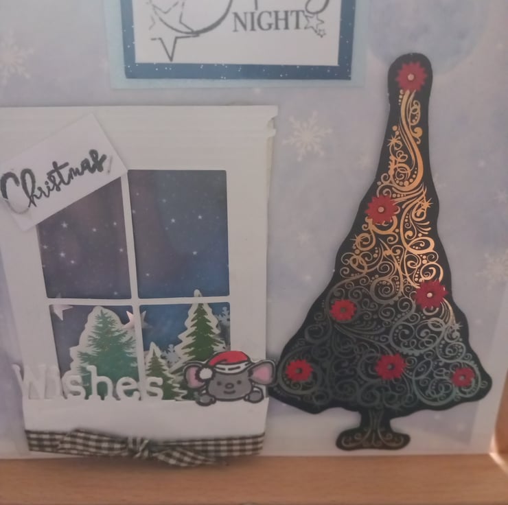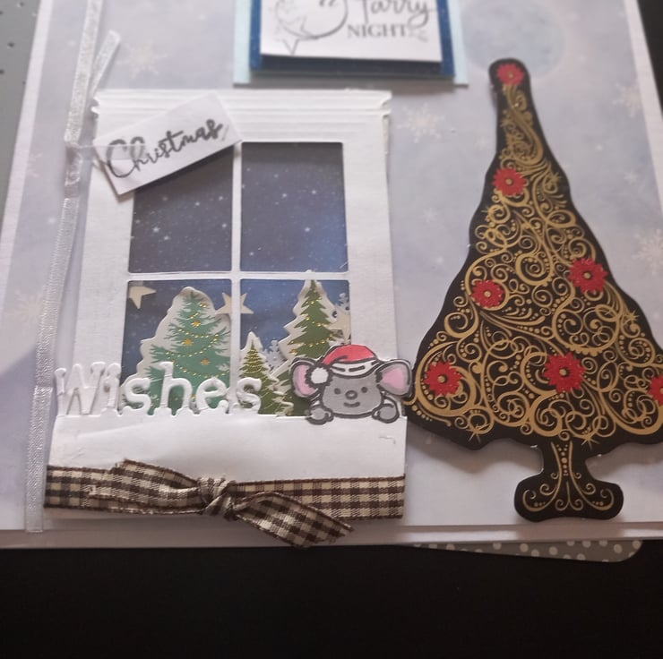 A shaker style Cheistmas card. Patternwd papee is laid on the card then a shaker style window with a festively dressed elephant and the wording Christmas Wishes. A Christmas tree is decoupaged on the xard and silver grey organza ribbon is down the side od tge card. The card is completed with the wording 'On a Starry Night'. This card measuees just under 8 x 8 inchea. The inside if the card has been lined wuth blue paper which has been left blank for your own meaaage.
