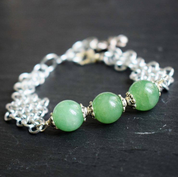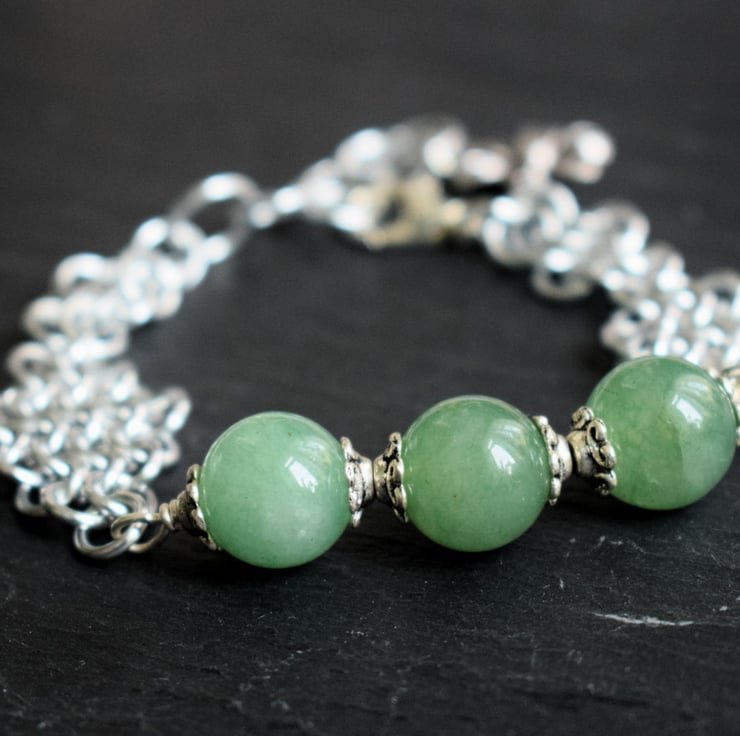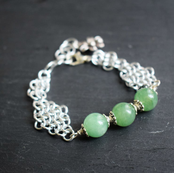There's a beautifully fluid feel to this bracelet, the green aventurine beads sit across the top of your wrist and the rest of the bracelet is made with chainmaille sections made of aluminium rings. I use aluminium because it is lightweight yet strong, it doesn't tarnish and is also hypoallergenic as it contains no nickel.