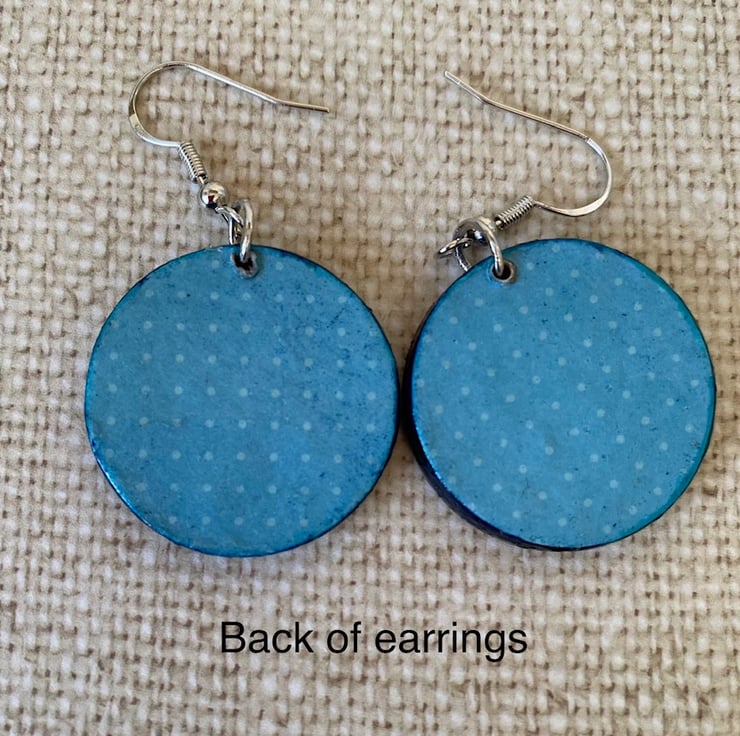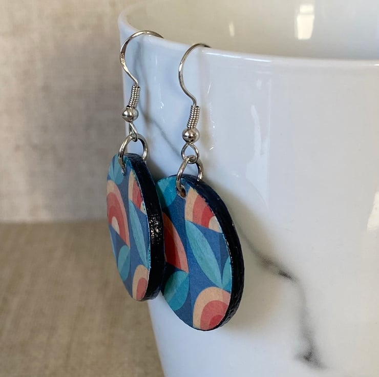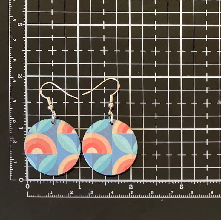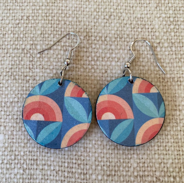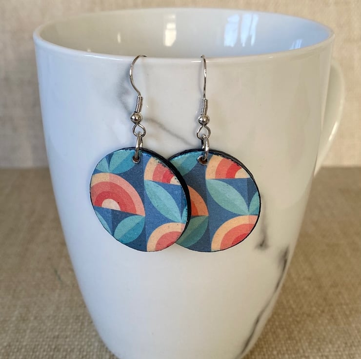 These earrings have been made completely from layers of paper and card, that I have bonded, sealed and varnished to make them into beautiful, wearable jewellery. The colours in this design are blue, teal, and orange, in a design that reminds me of sixties or seventies style. I have mounted them onto silver coloured wires. These earrings would look great with so many outfits, and you'll be wearing something truly unique. Of course, if you an bear to part with them, they would also make a lovely gift.