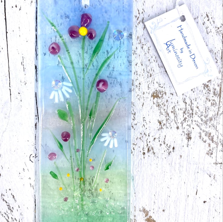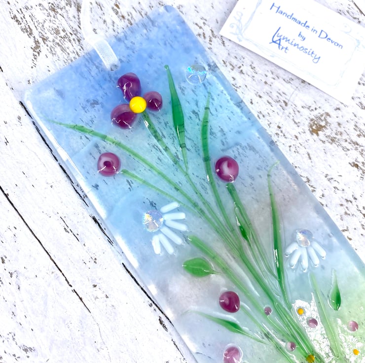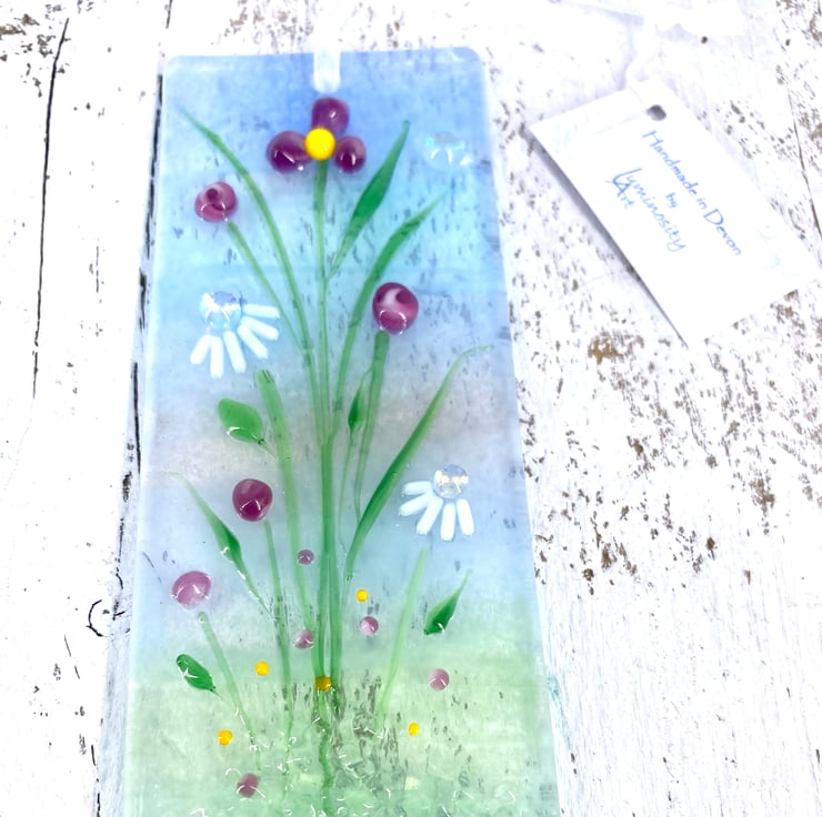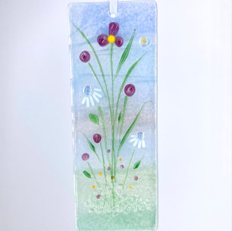 A lovely fused glass light catcher with a mix of pink & pastel flowers. Hung on a piece of organza ribbon it allows the light to travel through - this gives the piece depth and shows off the full beauty of the glass.