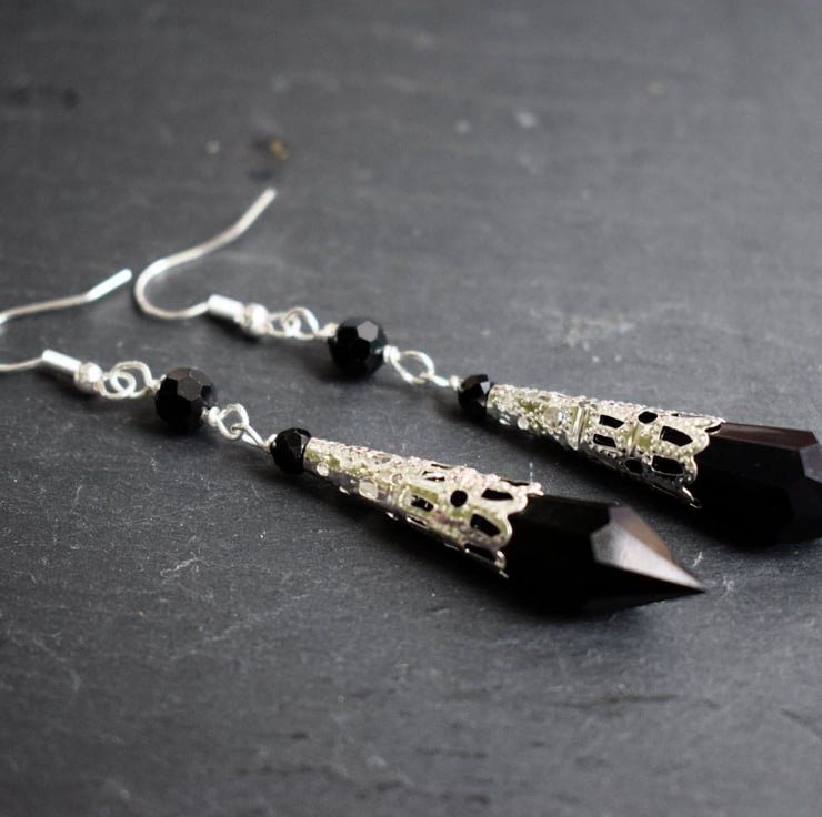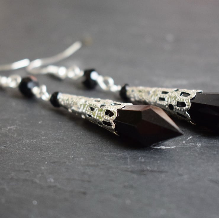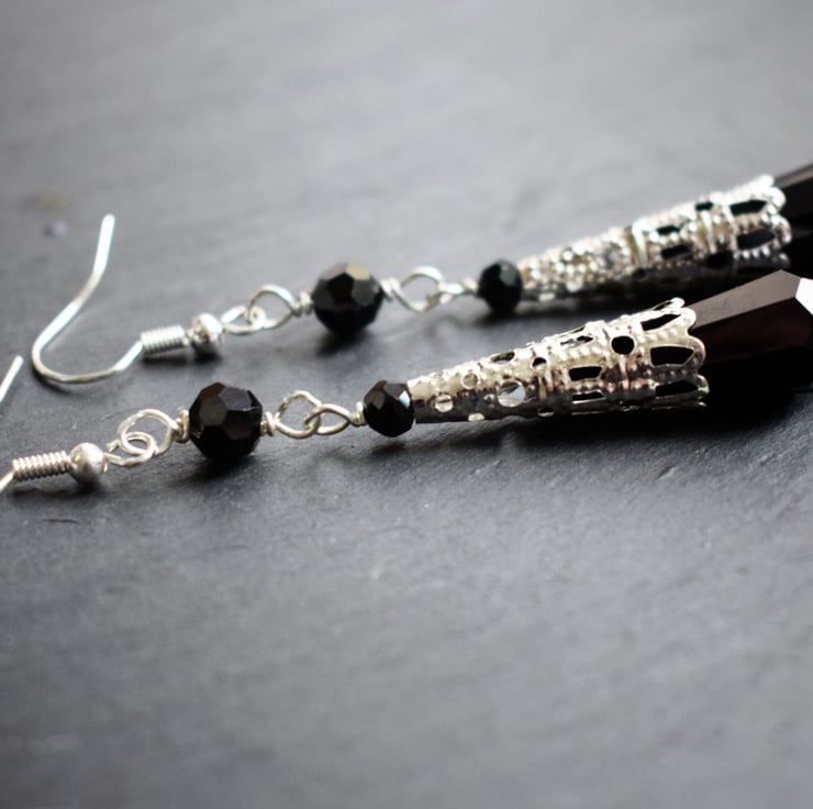 The black drop beads are wrapped in silverplated filigree wraps and finished with faceted black glass beads before being hung from silverplated earwires. You can also choose clip on fittings if you don't have pierced ears. Total lenght is just over 3 inches but because of materials used they are very lightweight to wear