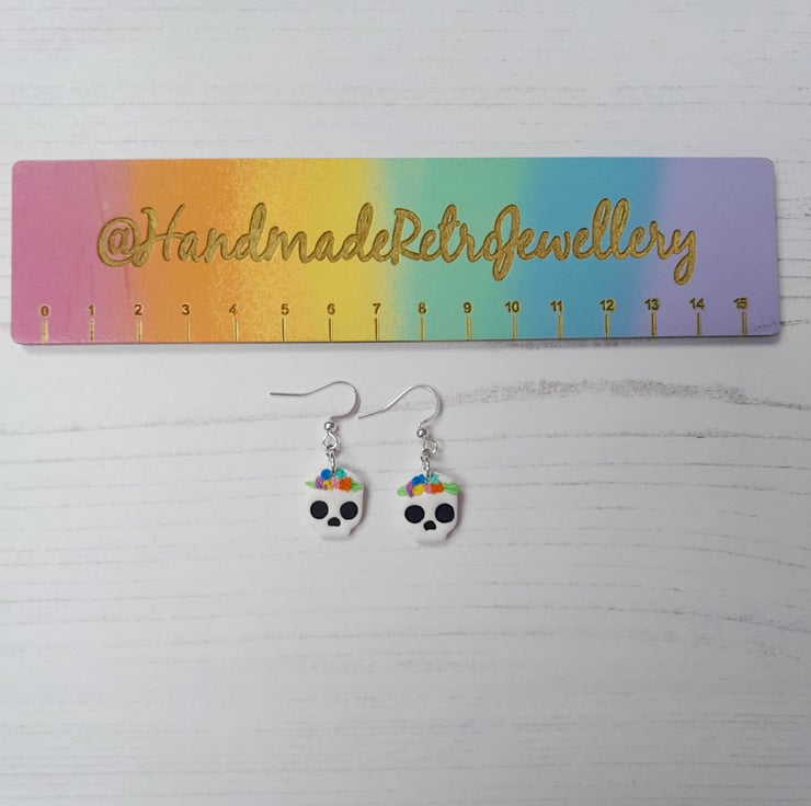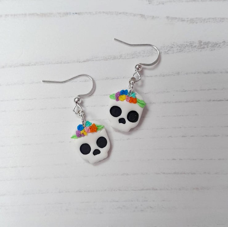 These mini earrings have been carefully hand crafted using polymer clay, in the shape of some spooky skulls. Complete with pastel coloured flowers to make a crown, and hand painted black eyes to finish.