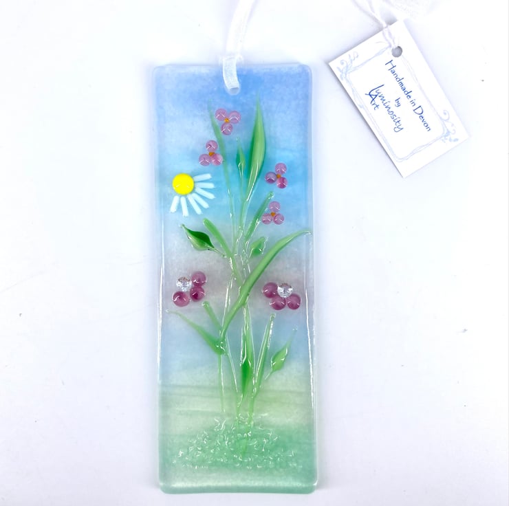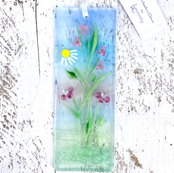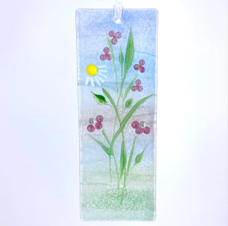 A lovely fused glass light catcher with a mix of pink flowers and a little daisy. Hung on a piece of organza ribbon it allows the light to travel through - this gives the piece depth and shows off the full beauty of the glass.