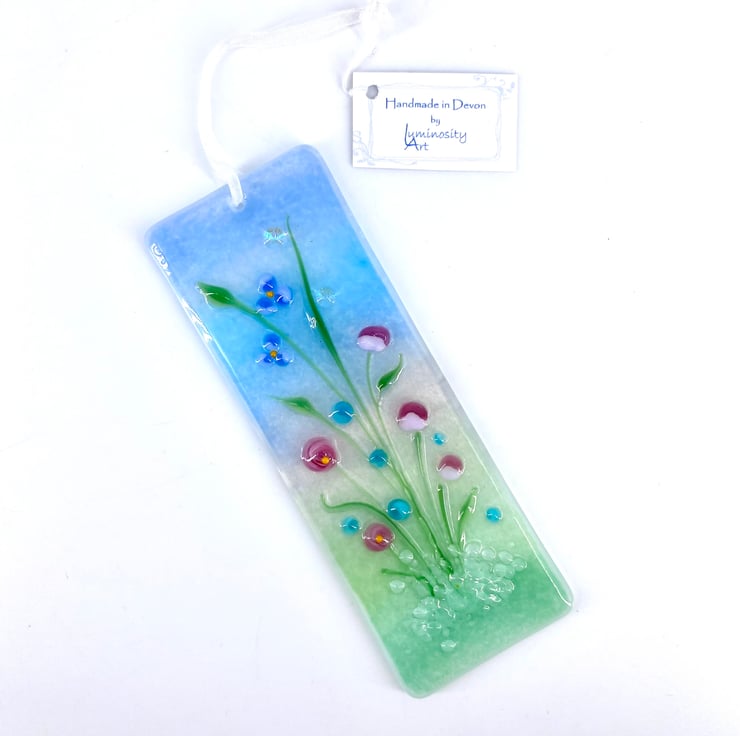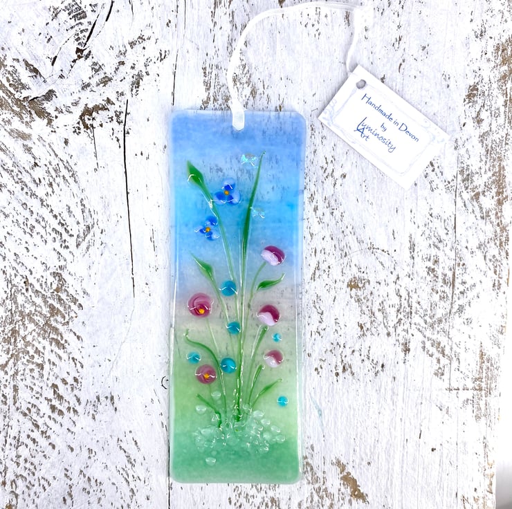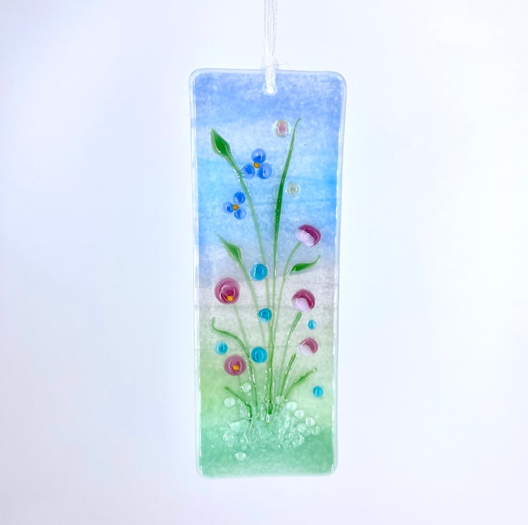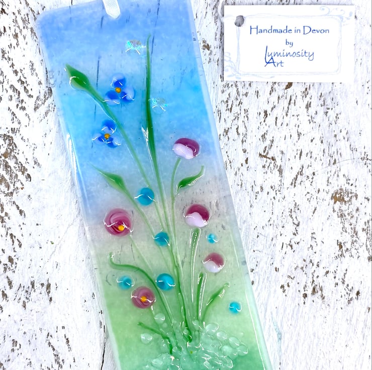 A lovely fused glass light catcher with a mix of pretty pastel flowers. Hung on a piece of organza ribbon it allows the light to travel through - this gives the piece depth and shows off the full beauty of the glass.