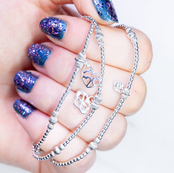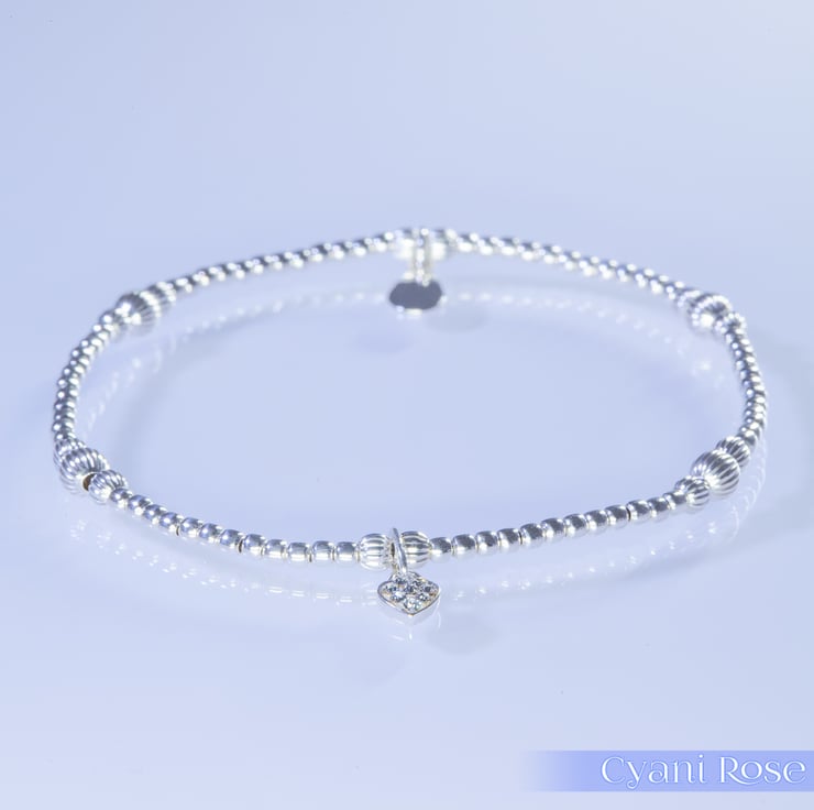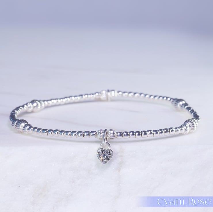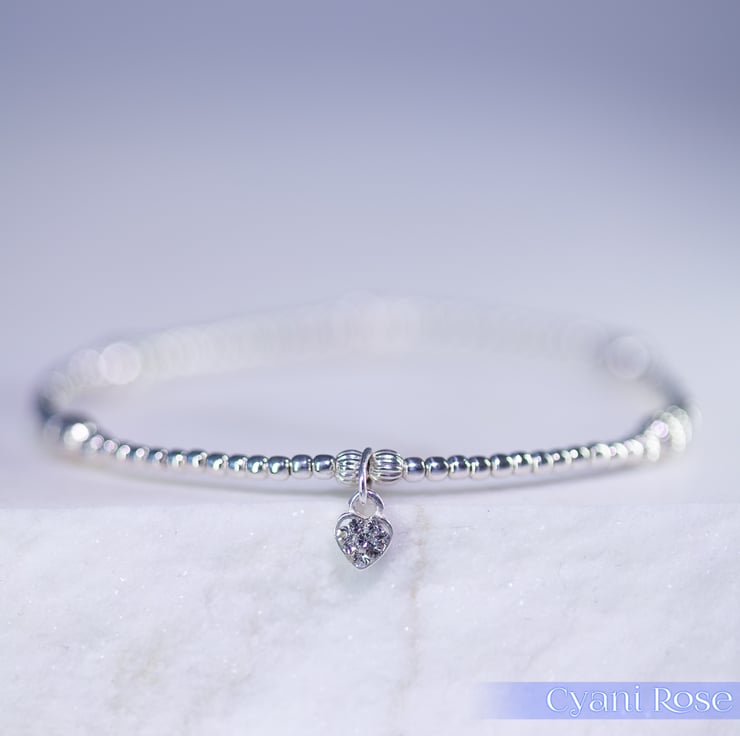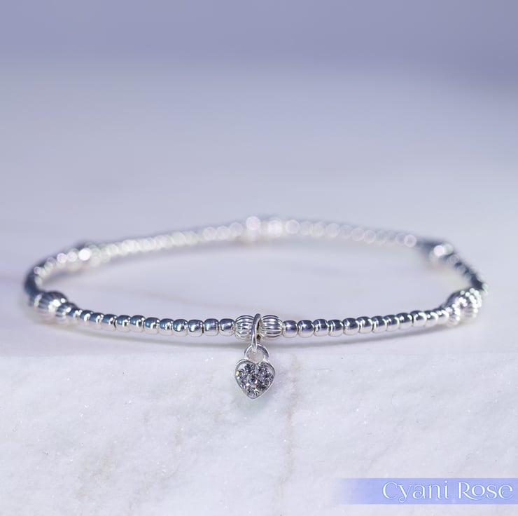 Sparkly Heart Charm Bracelet Sterling Silver Dainty Handmade Romantic Stretchy
