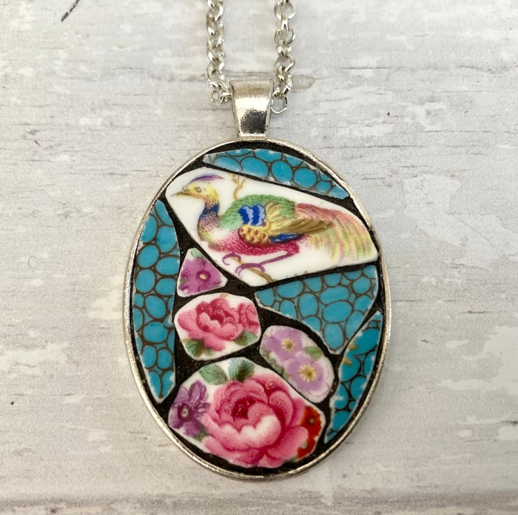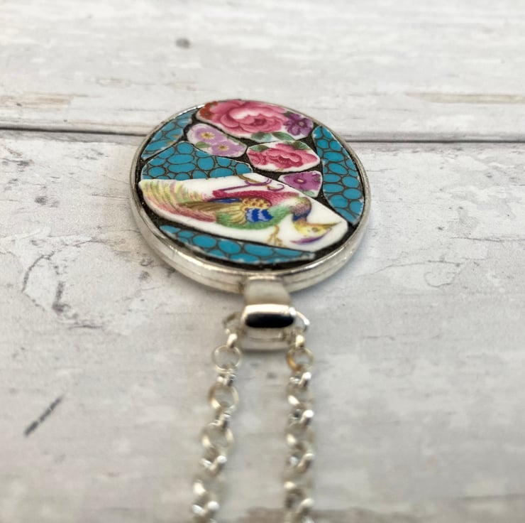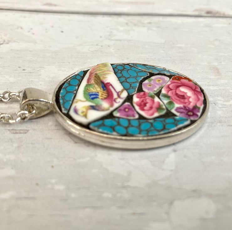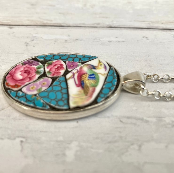 This beautiful handmade broken china mosaic pendant necklace has been crafted using a Ye Olde Engish Grosvenor vintage china plate. It is carefully set and grouted into a silver plated mount with an silver plated 20 inch belcher style chain.