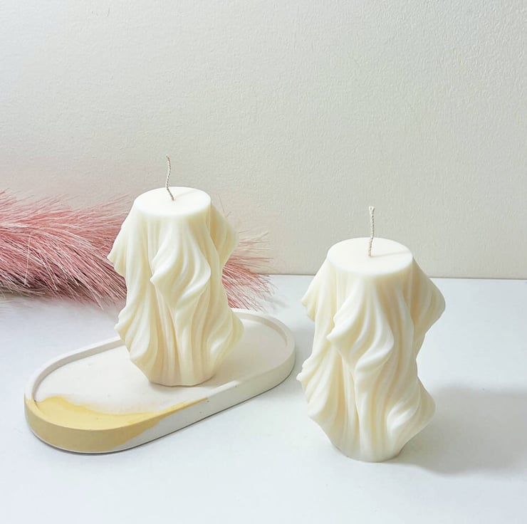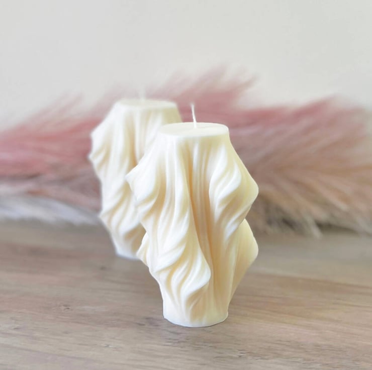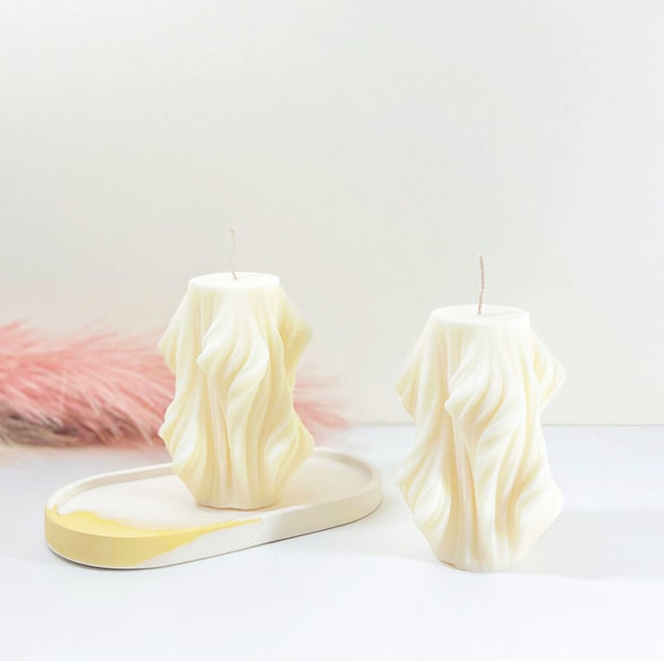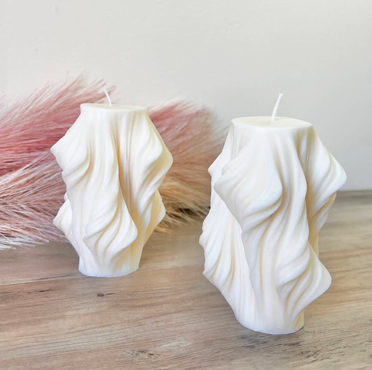 Sculptural swirly pillar candles. Light up any space in your home with our swirling ripple soy candles. Perfect for house warming gifts, birthdays, and special events, these candles have a unique curvy ruched design and come in either a classic cream soy wax or in a range of gentle pastel colors. Create a beautiful atmosphere in your living room, bedroom, or any other space.
