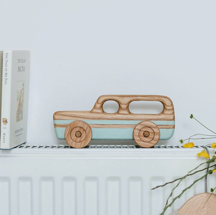 Drawing inspiration from iconic station wagons from the '60s each & every toy car is designed & handcrafted from start to finish here in the U.K. from sustainably sourced oak wood from FSC certified suppliers then lovingly hand-painted in Eco-certified, non-toxic, water-based paints. Making each car completely unique with no two cars the same.