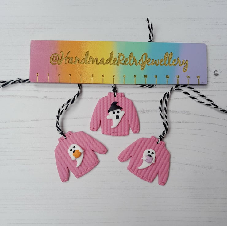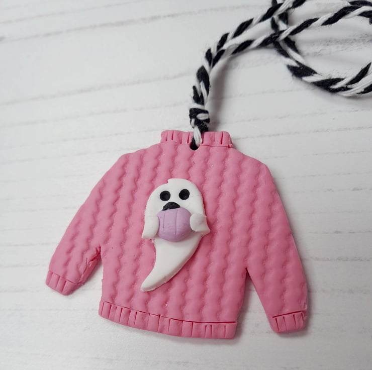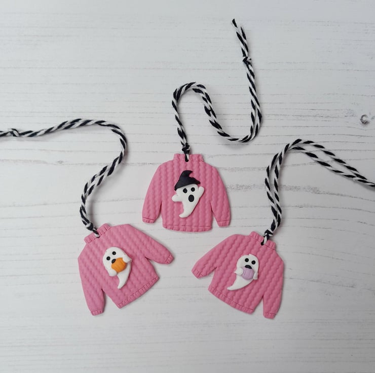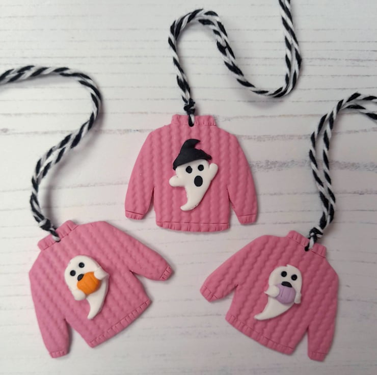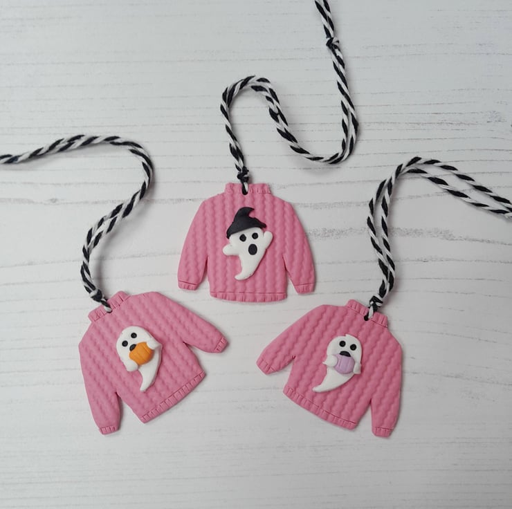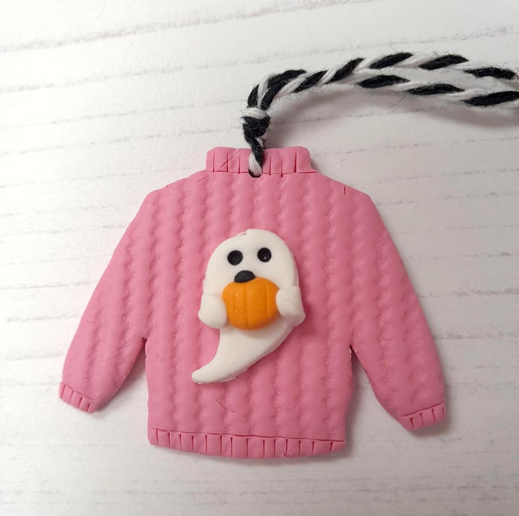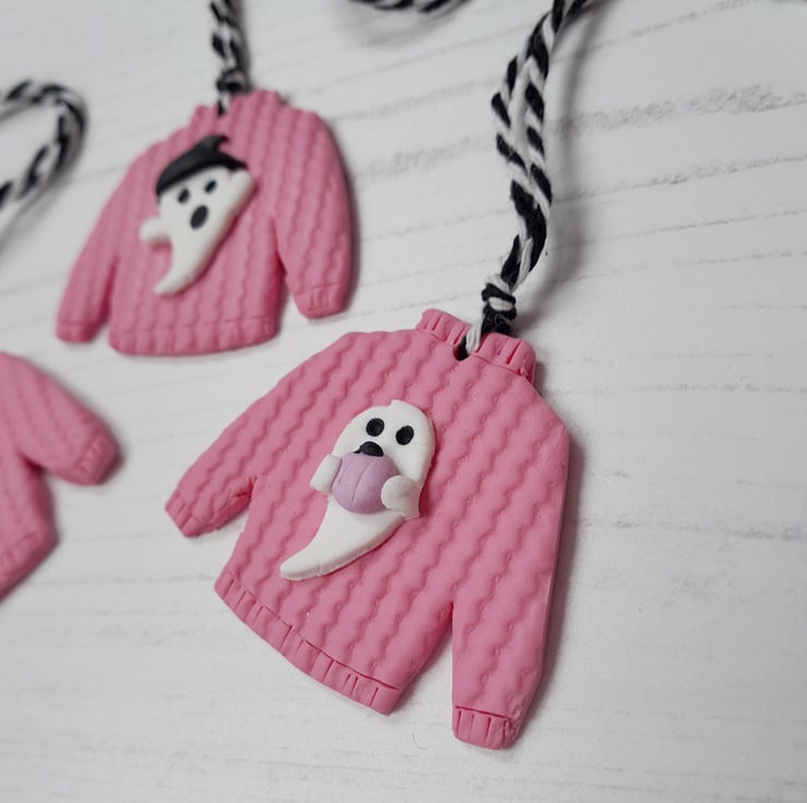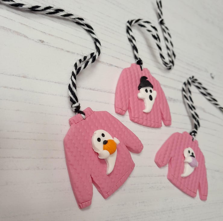 These cute halloween decorations have been carefully hand crafted using polymer clay, with a hand mixed candy pink jumper with knit pattern, then small ghosts added on the top - choose from a ghost with a witches hat, a lilac pumpkin or an orange pumpkin!