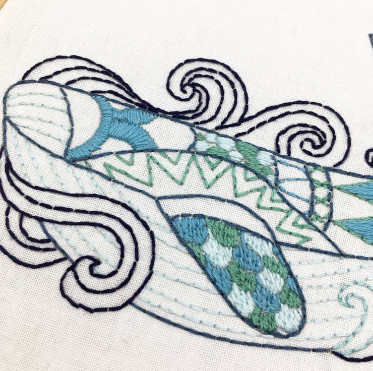 This whale was inspired by the colours of the sea as it turns from light blues and greens where it is shallow, on to dark blue as the water gets deeper. It was also designed to look great with out Turtle Embroidery kit, using a lot of the same colours.