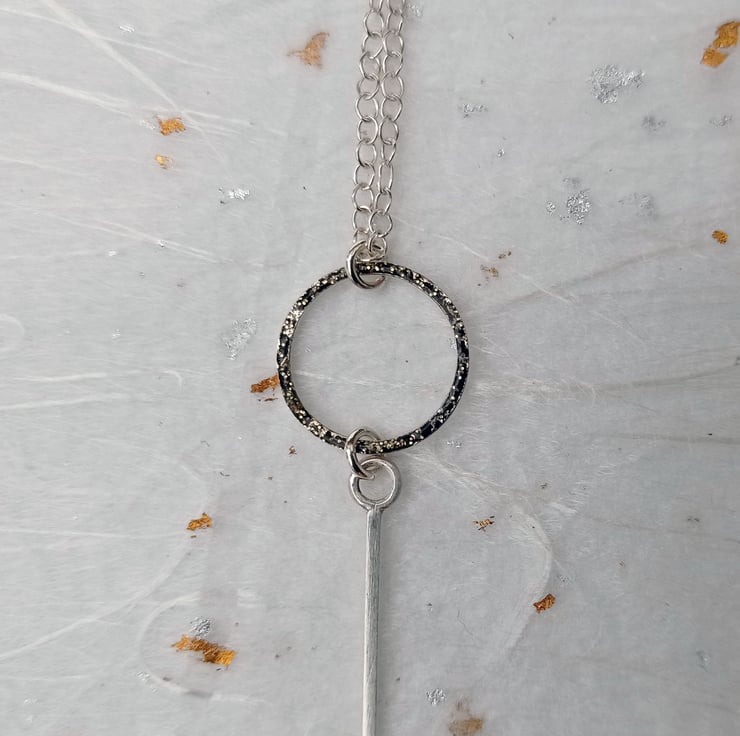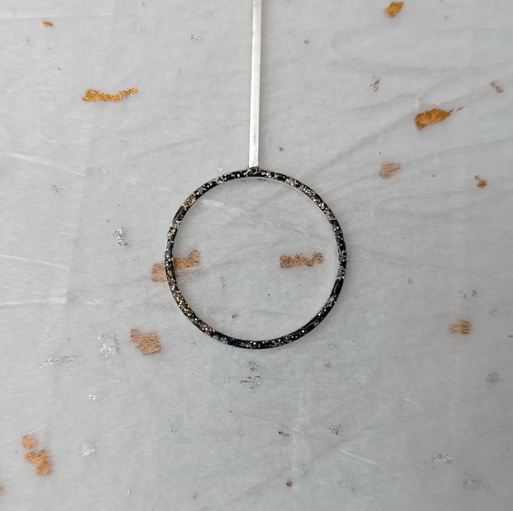 I have created this necklace by shaping and soldering recycled sterling silver square wire. I have then added black and gold glitter cold fire enamel to one side of each of the circles. To finish, the pendant has been attached to sterling silver chain. This necklace is part of small collection of similar pieces.