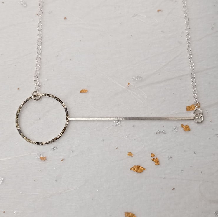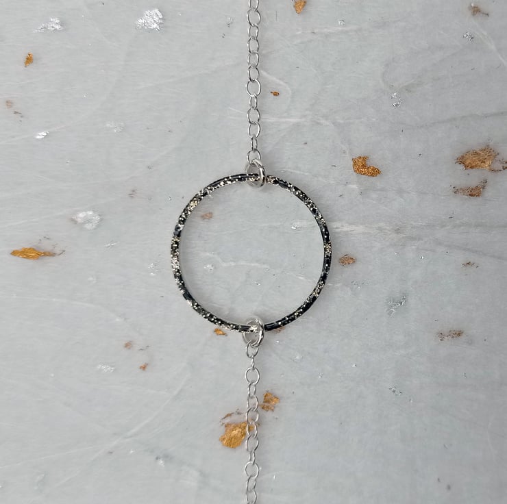 I have created this minimalist necklace by shaping and soldering recycled sterling silver square wire. I have then added black and gold glitter cold fire enamel to one side of each of the circles. To finish, the pieces have been attached to sterling silver chain. This necklace is part of small collection of similar pieces.