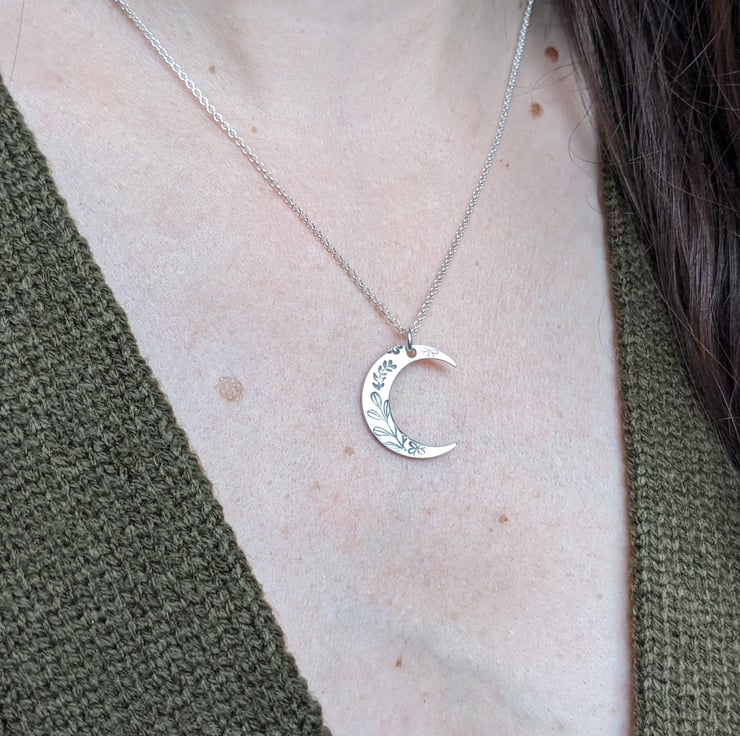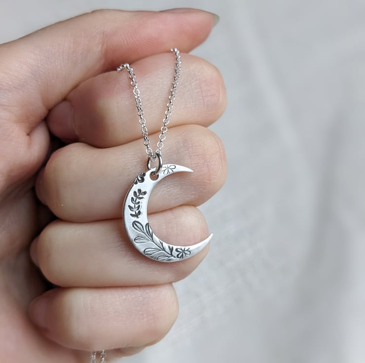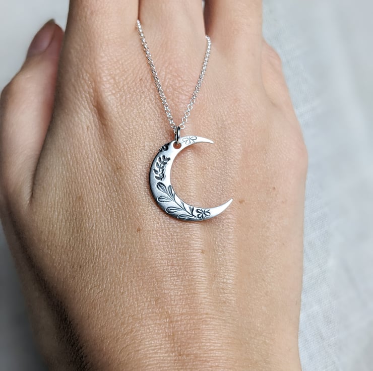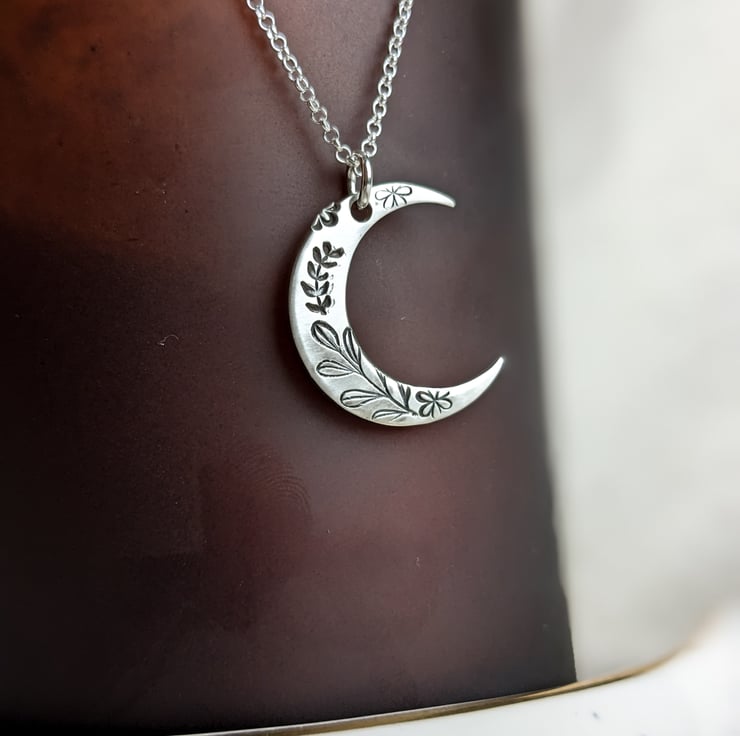 This is a crescent moon necklace, made from sterling silver and hand stamped with a botanical design, on an 18" sterling silver chain. Made in my workshop in West Yorkshire.