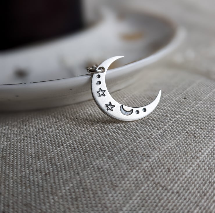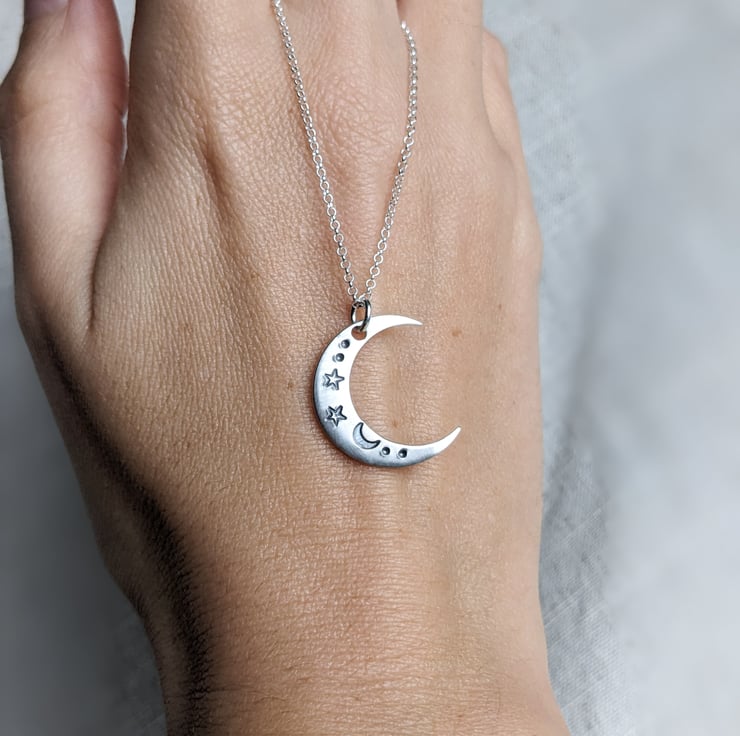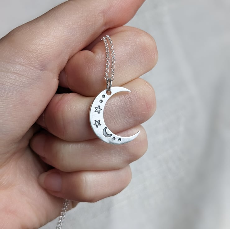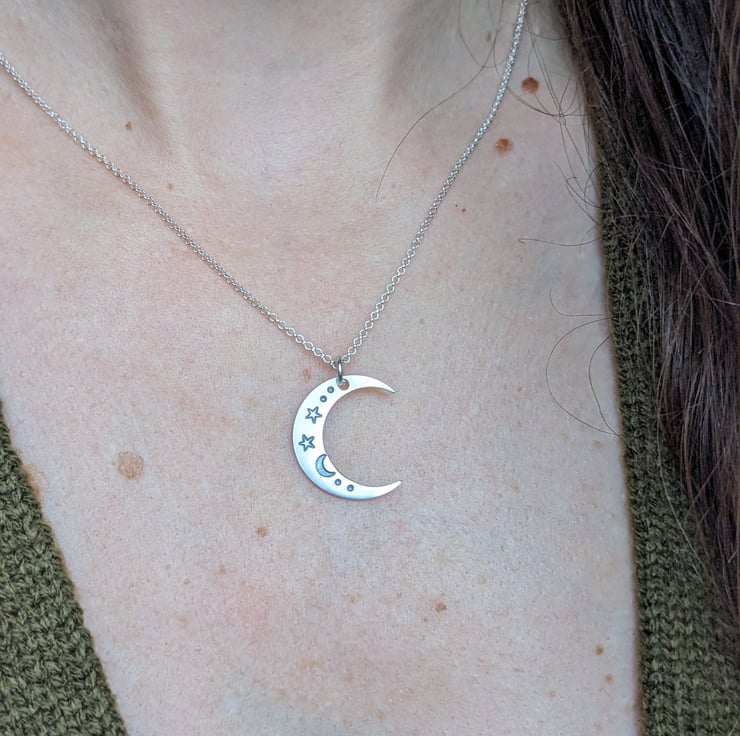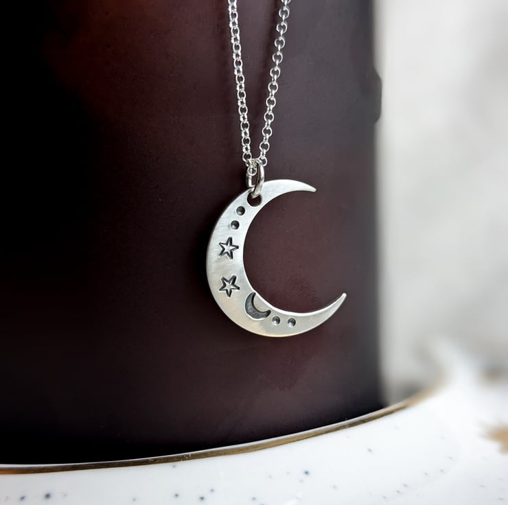 This is a crescent moon necklace, made from sterling silver and hand stamped with a a celestial moon and stars design, on an 18" sterling silver chain. Made in my workshop in West Yorkshire.