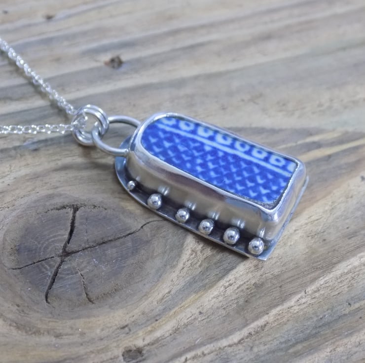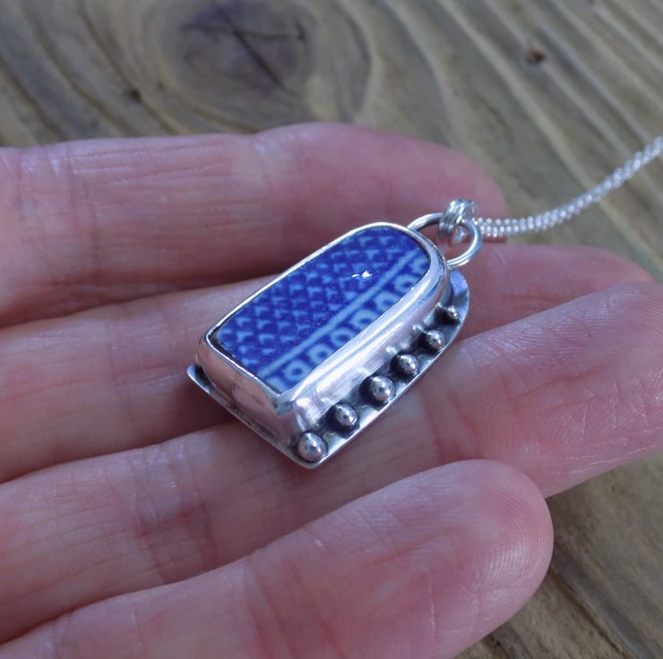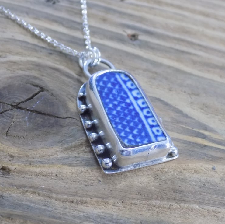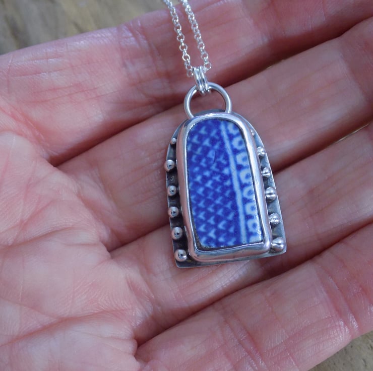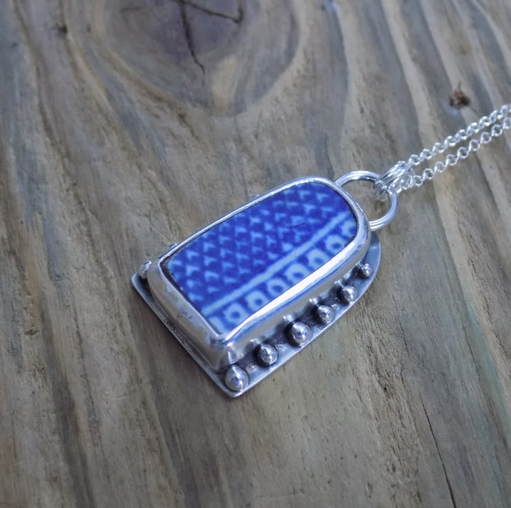 The pottery piece has been roughly shaped into an organic arch, and fitted with a custom made bezel , decorated with tiny silver dots around the edge. Simply suspended form an 18" sterling silver belcher chain.