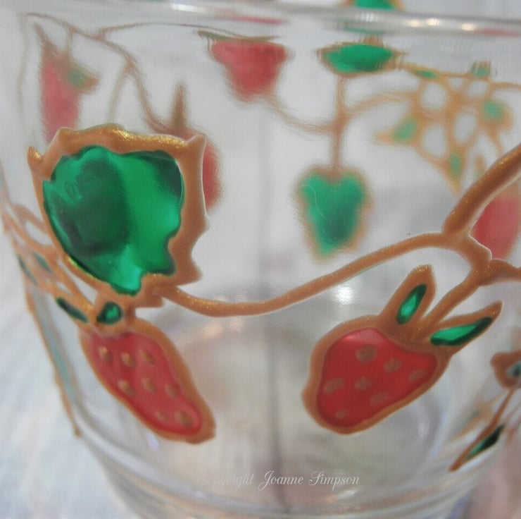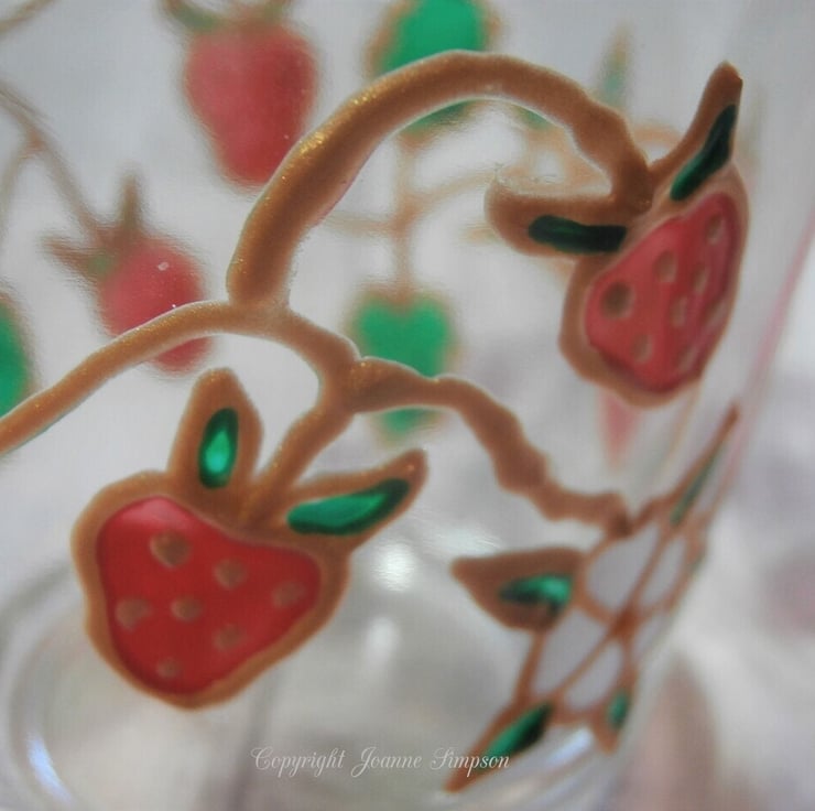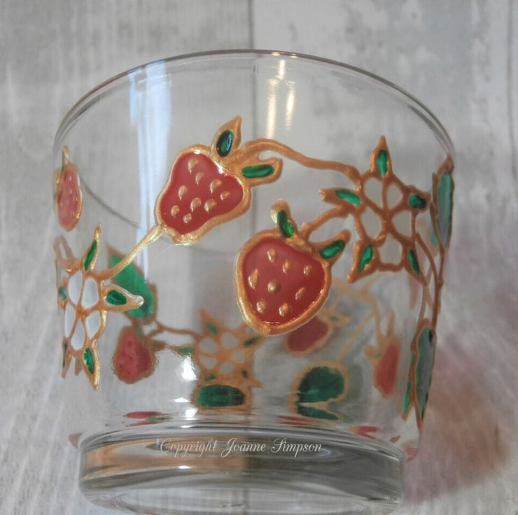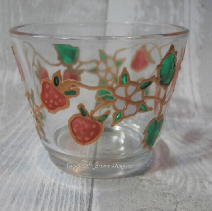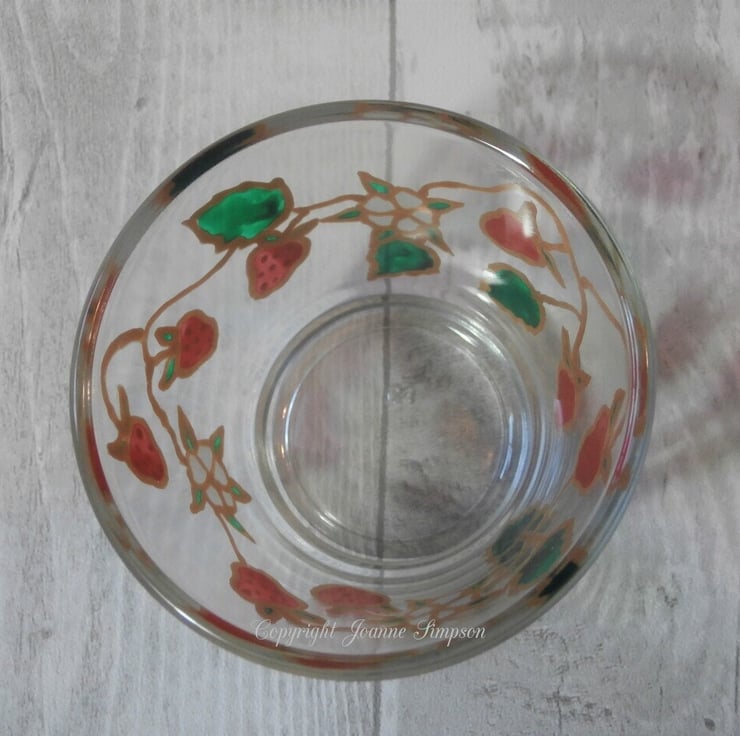 'Strawberry trail' hand painted tealight holder. This is a design I used to do many years ago when I was glass painting. This tealight is adorned with lovely bright red berries, green glossy leaves and some white Strawberry flowers.. These look really pretty when lit as the pattern will show on surrounding surfaces. Measures7.5cm at the top, 5cm at the base and 6cm high . These make a lovely little gift. Includes a tealight.