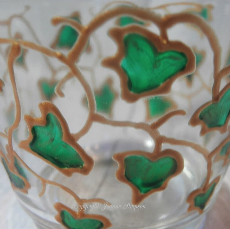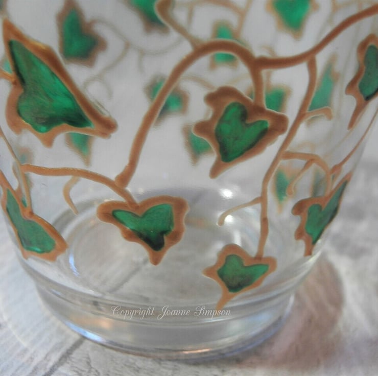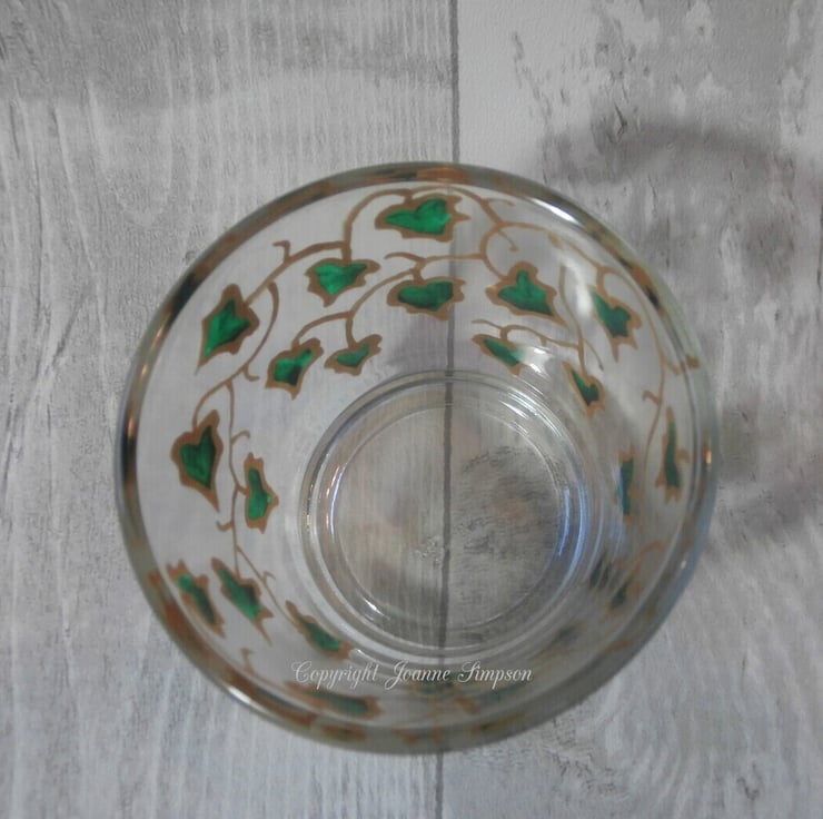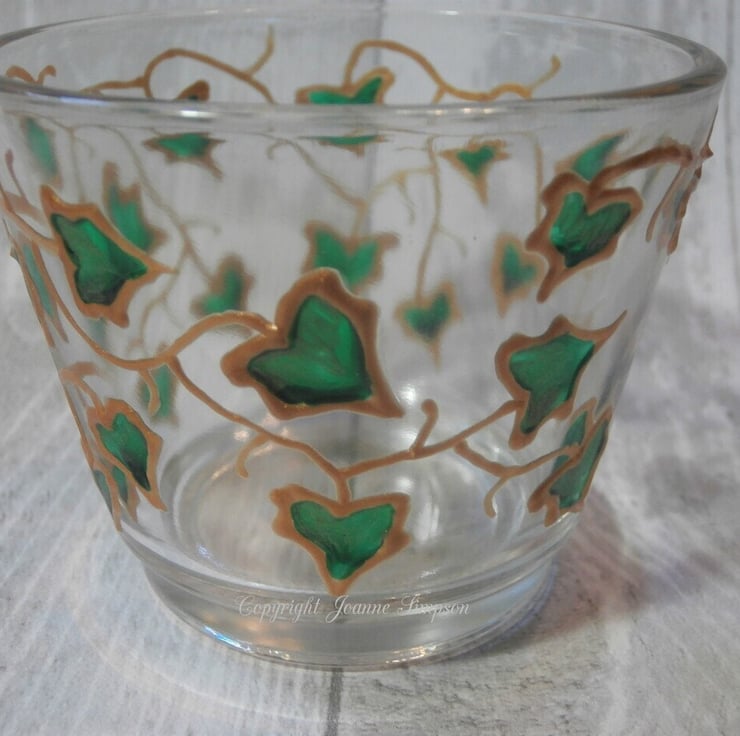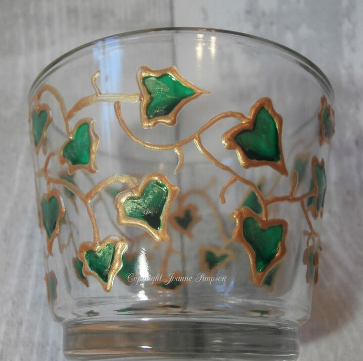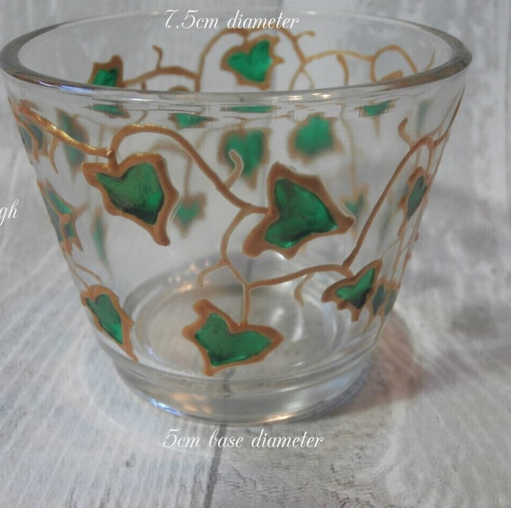 'Ivy trail' hand painted tealight holder. This is a design I used to do many years ago when I was glass painting. Each Ivy leaf is painted with a deep glossy green with a hint of paler sparkly green on the base. These look really pretty when lit as the pattern will show on surrounding surfaces. Measures 7.5cm at the top, 5cm at the base and is 6cm high. Includes a tealight.