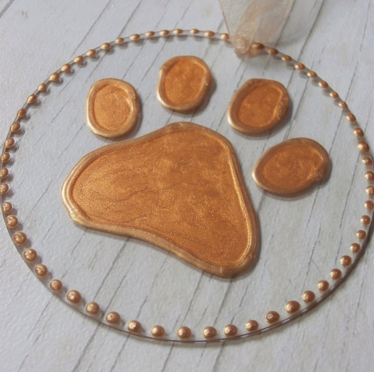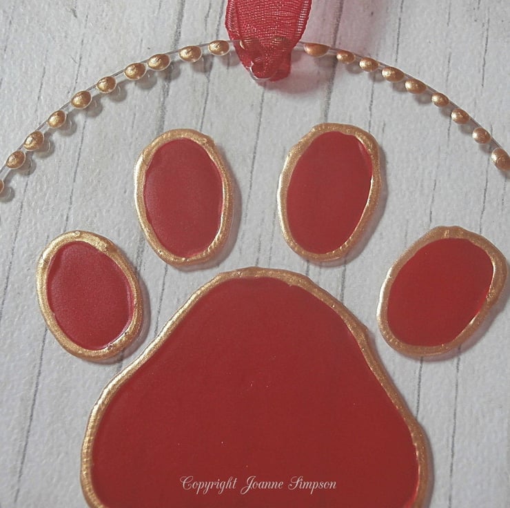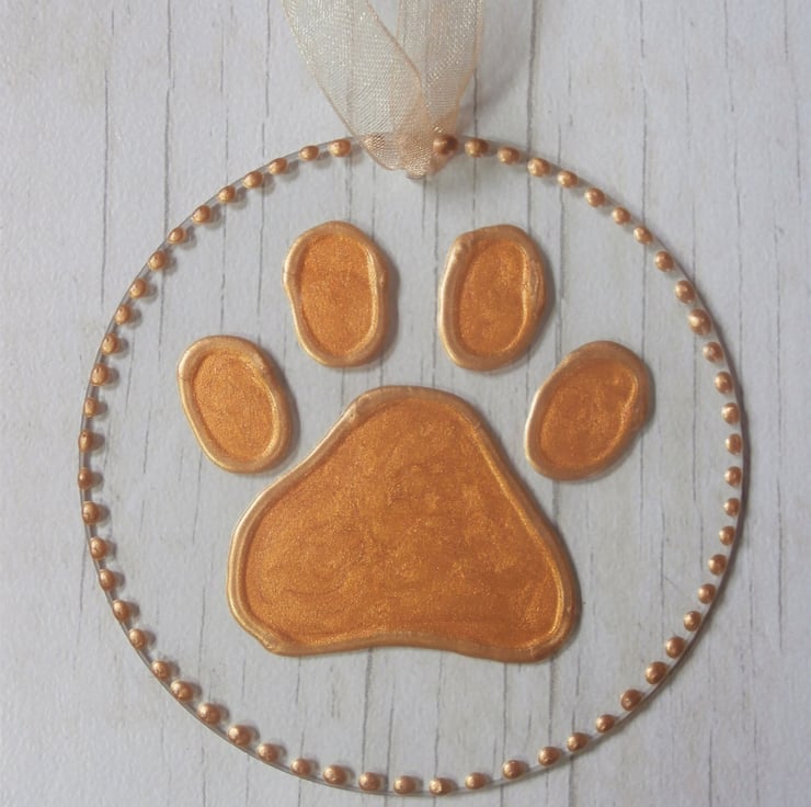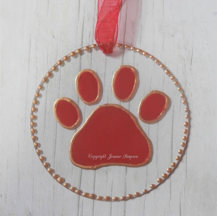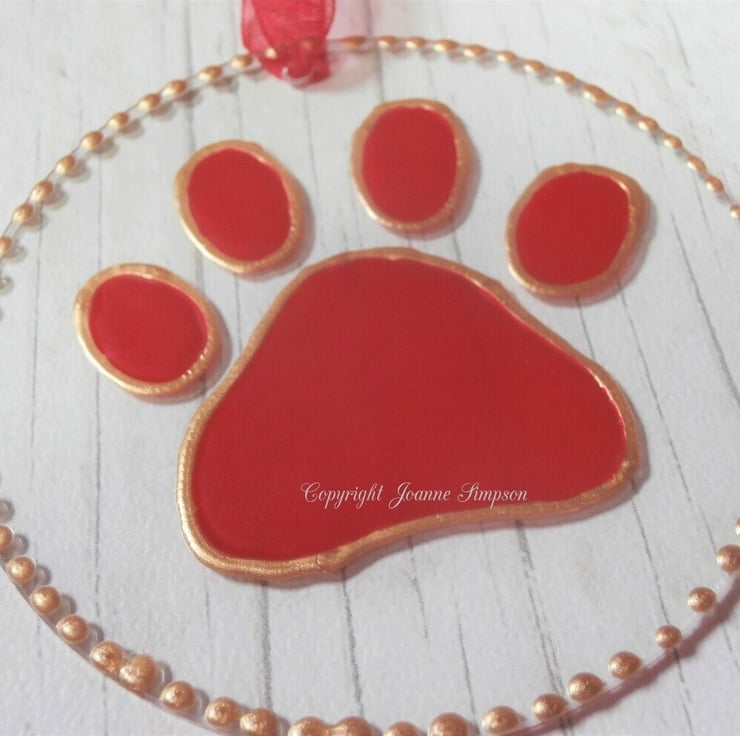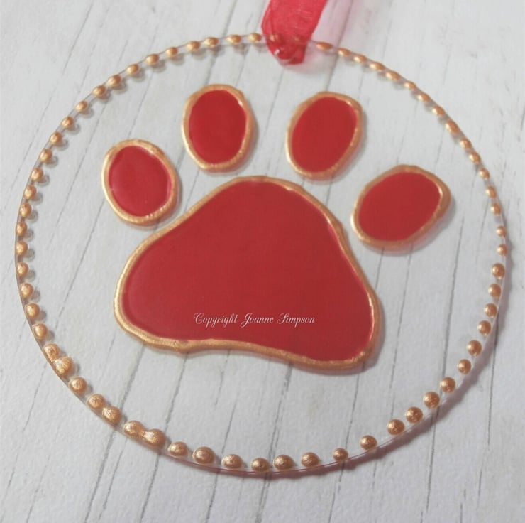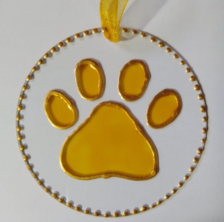 Gold, frosted red, glossy red or glossy yellow coloured paw print outlined with gold coloured outliner. The surrounding area is clear glass. Finished with a matching organza ribbon.