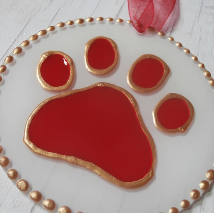 Glossy red paw print outlined with gold coloured outliner. The back of the glass is painted white. Finished with a red organza ribbon.