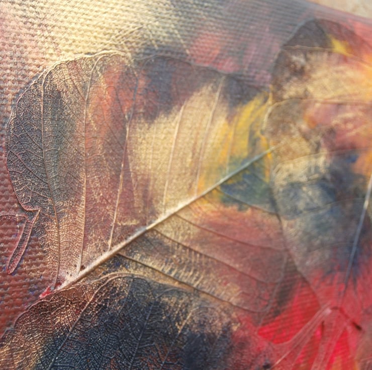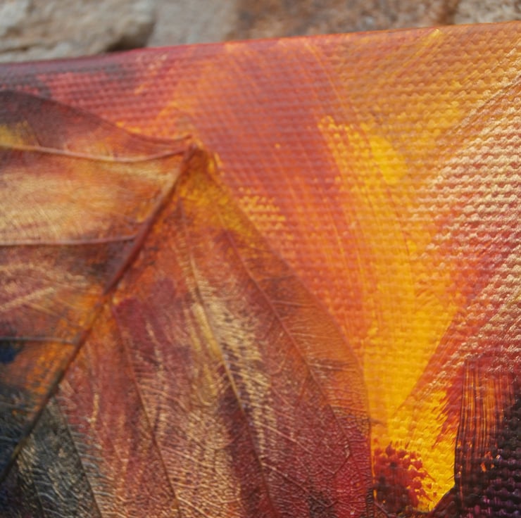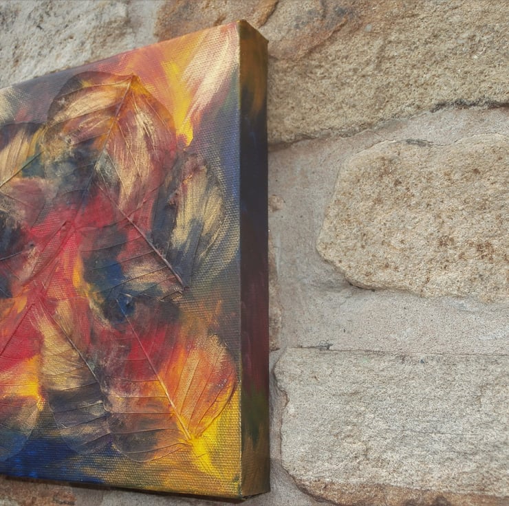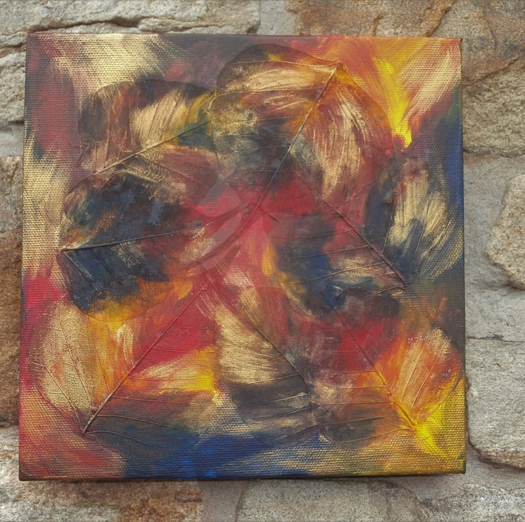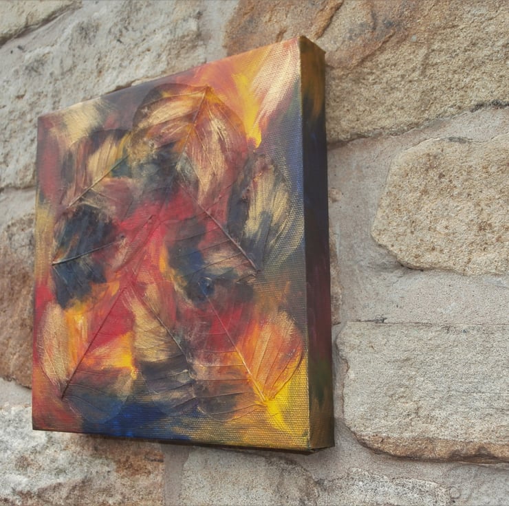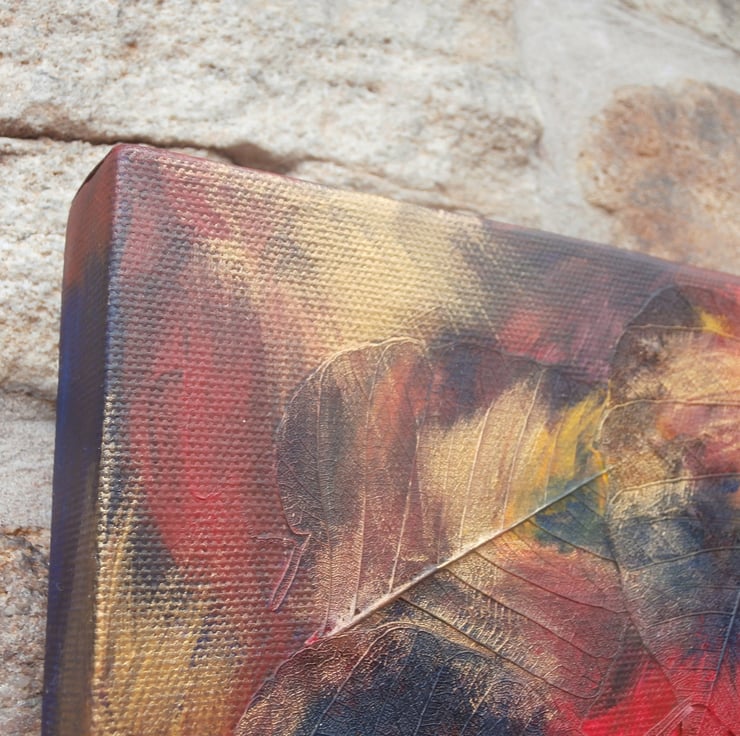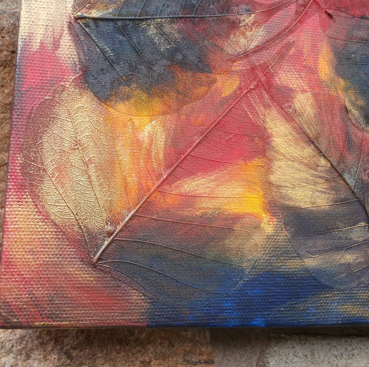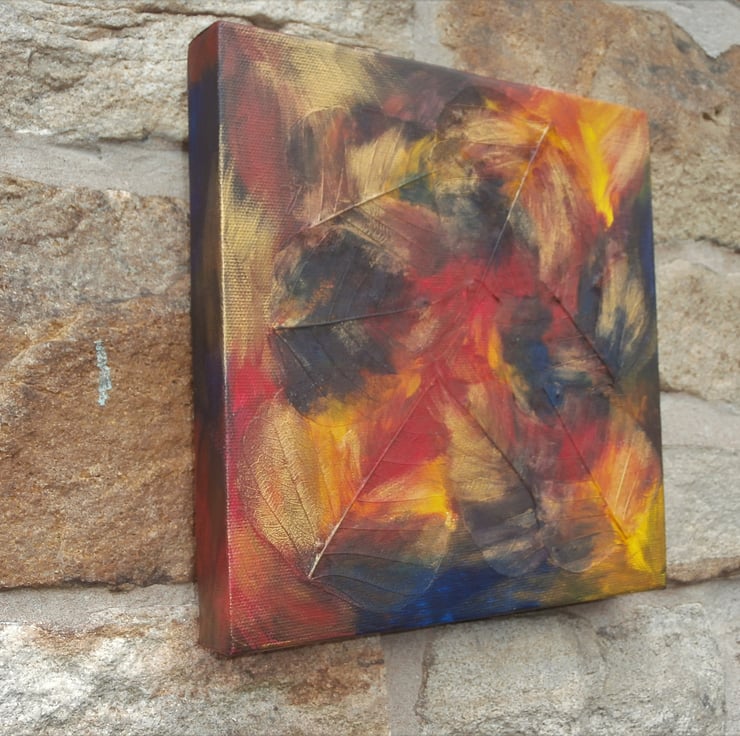 This is a striking little piece. Very vibrant colours with a metallic finish. Skeleton leaves and acrylic on boxed canvas. A lovely textured piece called 'Deep Autumn'. 8x8 inches square and 1 inch deep. If you have a plain wall that needs a pop of colour then this is the painting for you.