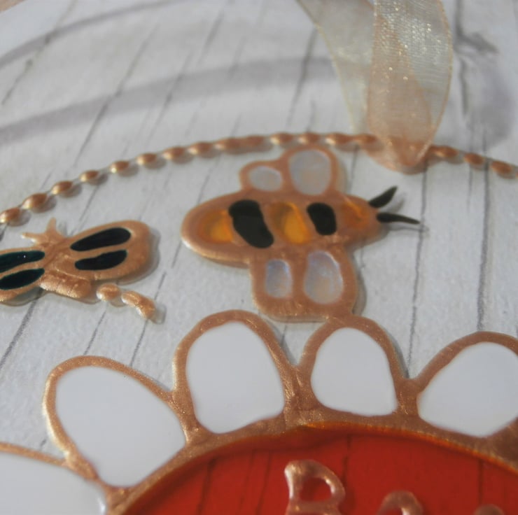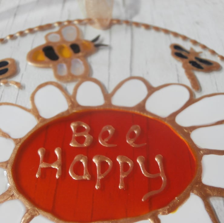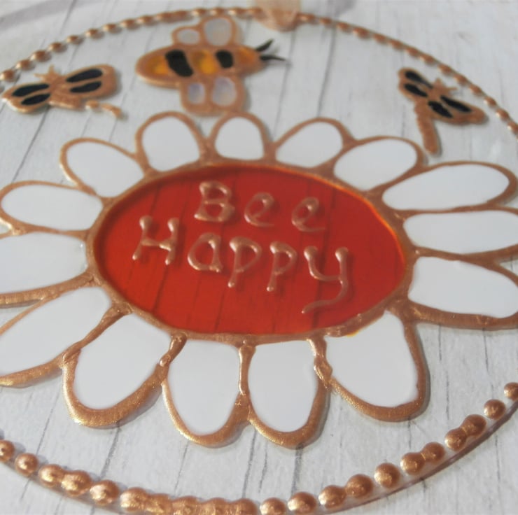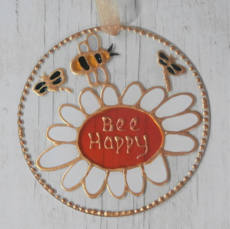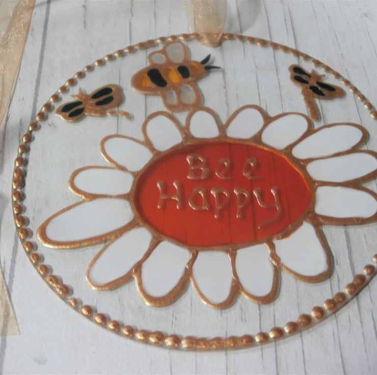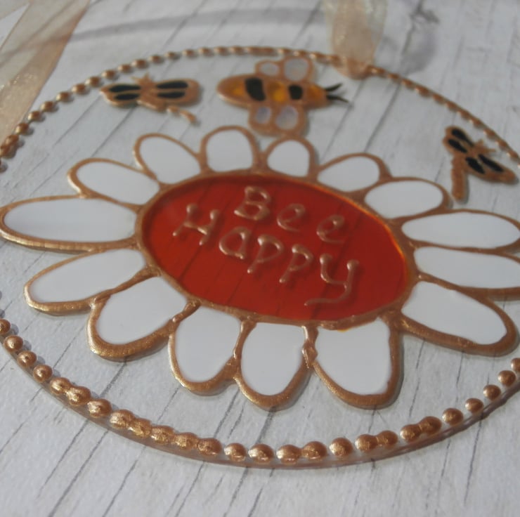 A beautiful sun catcher featuring my Bee and daisy design with the inspirational wording 'Bee Happy'. This would make a lovely gift and it will sparkle in the sunlight. Finished with a pale gold organza ribbon.