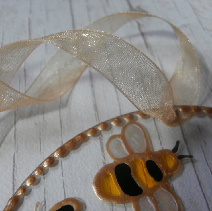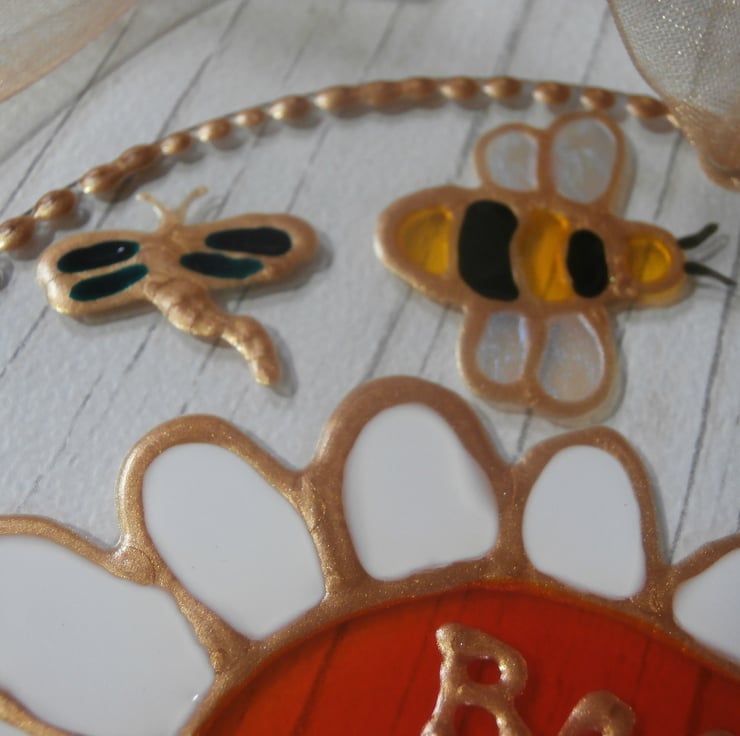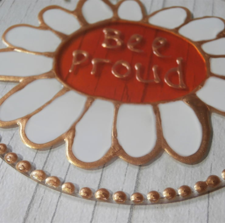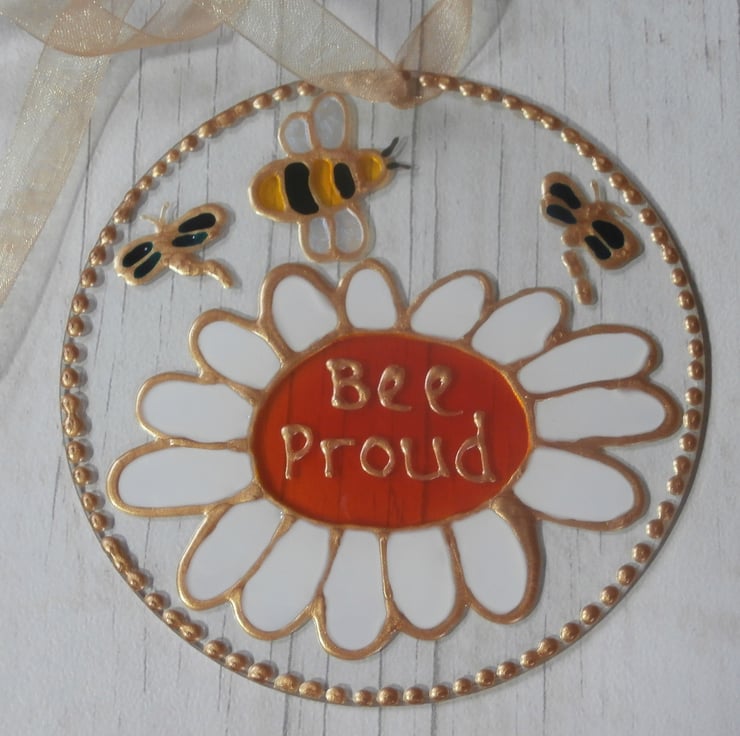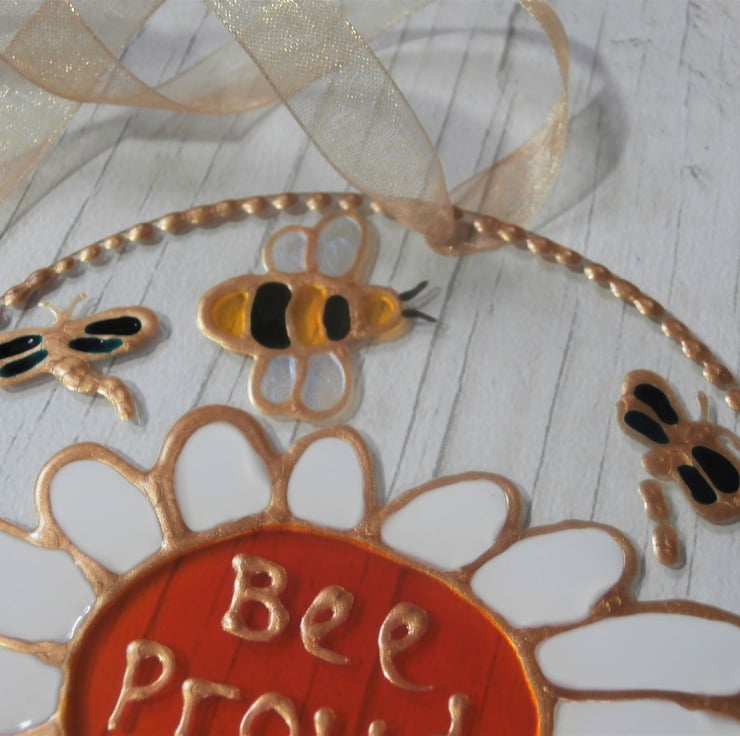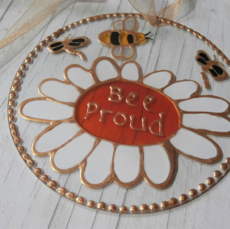 A beautiful sun catcher featuring my Bee and daisy design with the inspirational wording 'Bee Proud'. This would make a lovely gift and it will sparkle in the sunlight. Finished with a pale gold organza ribbon.