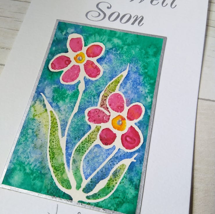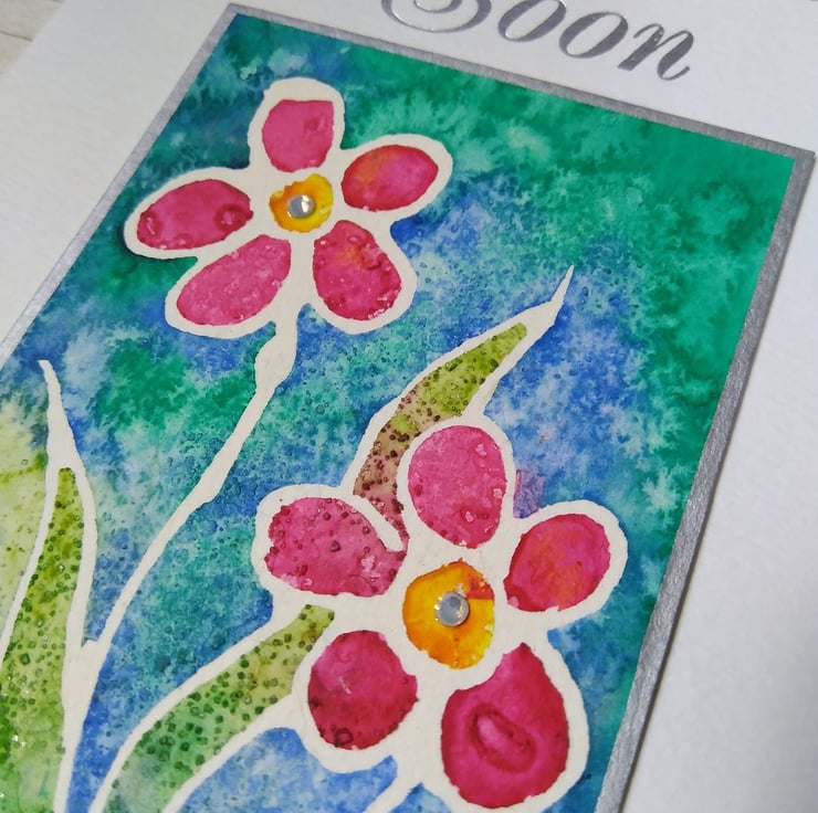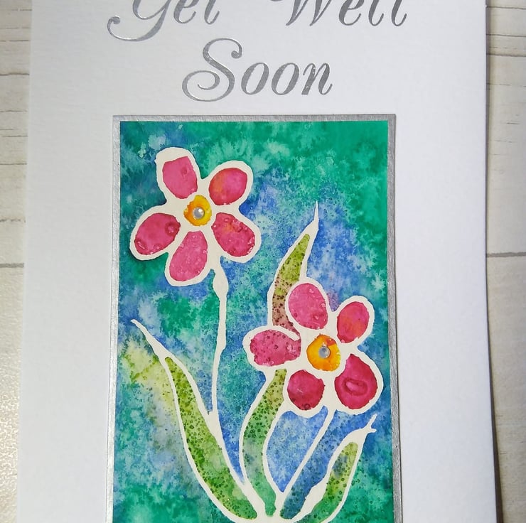 This is a beautiful hand painted watercolour card embossed with 'Get Well Soon' in silver coloured lettering.. A really special card to let someone know that you are thinking about them.