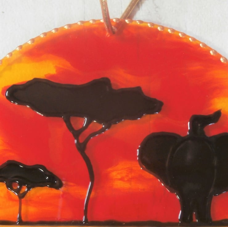 This is a truly beautiful sun catcher. The colours are amazing. Totally unique and hand painted by me with my African plain and Elephant design.