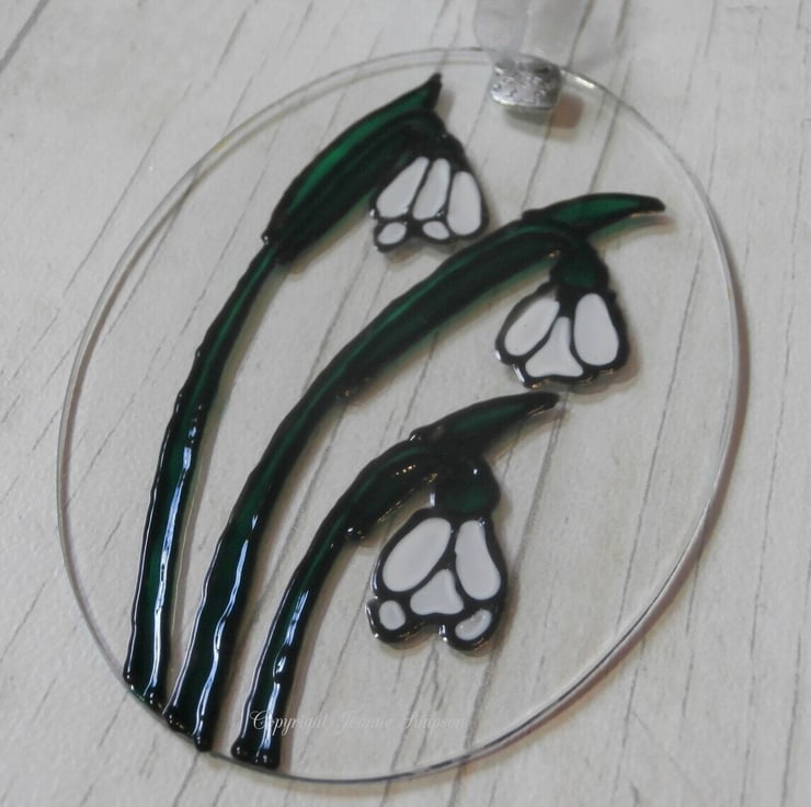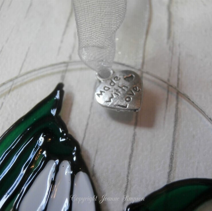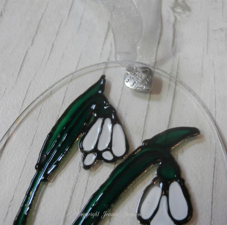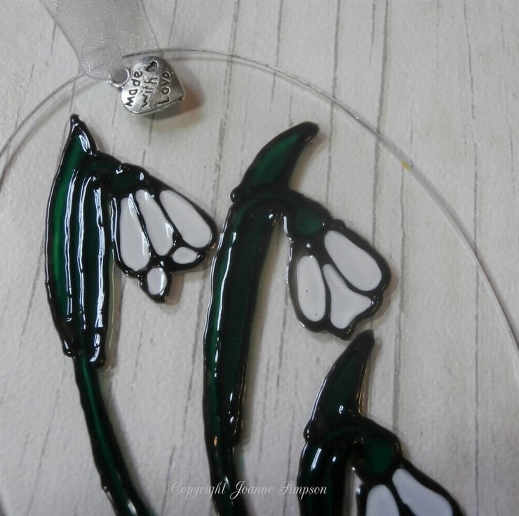 'Snowdrops' sun catcher decoration finished with a silver organza ribbon and a 'made with love' charm. Mother's day, Birthday, Thinking of you, Anniversary.