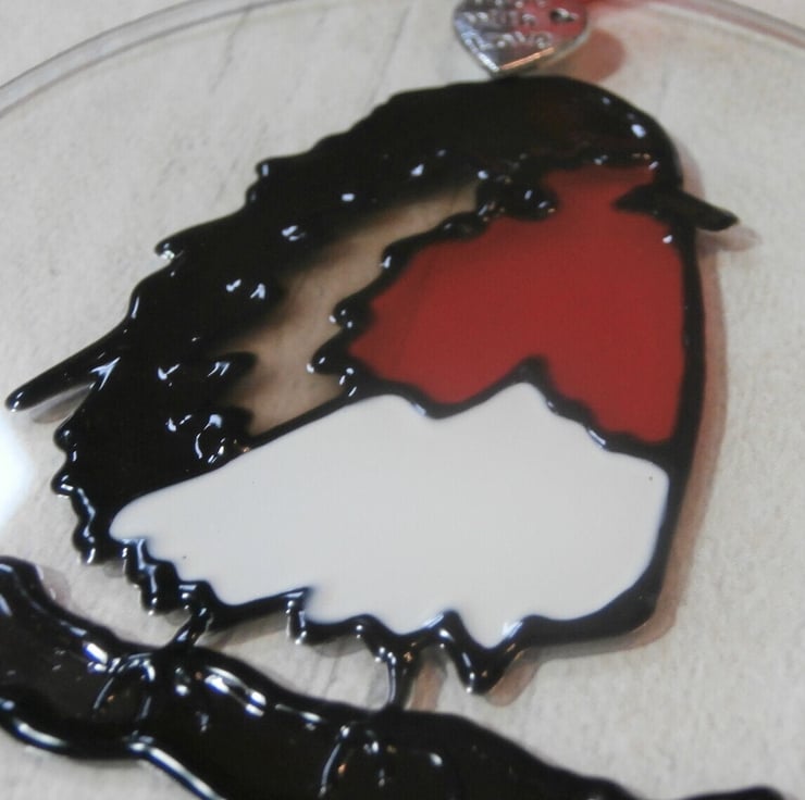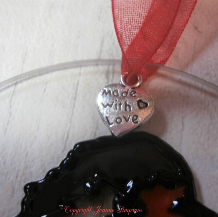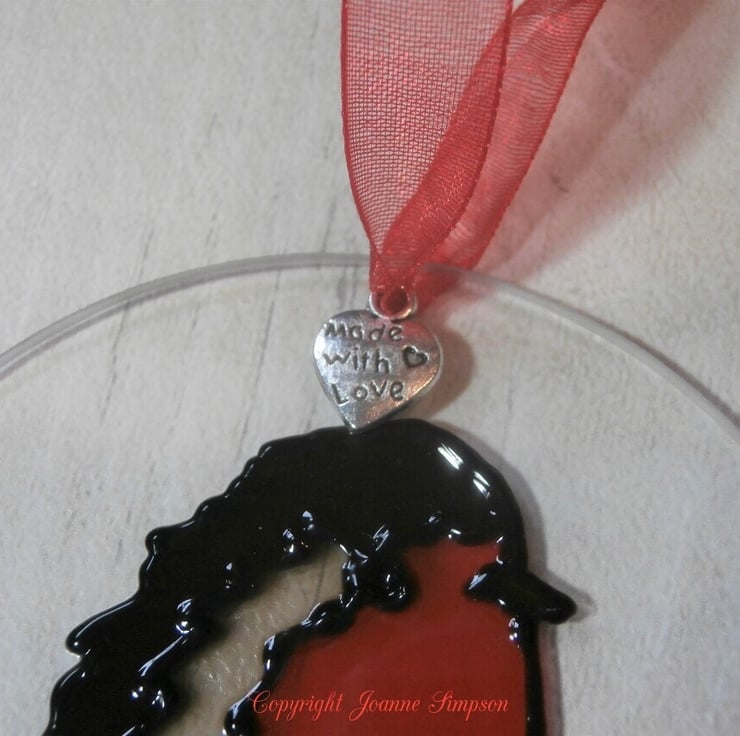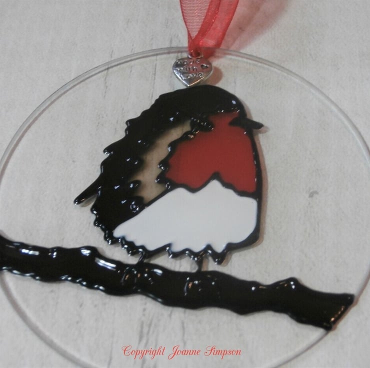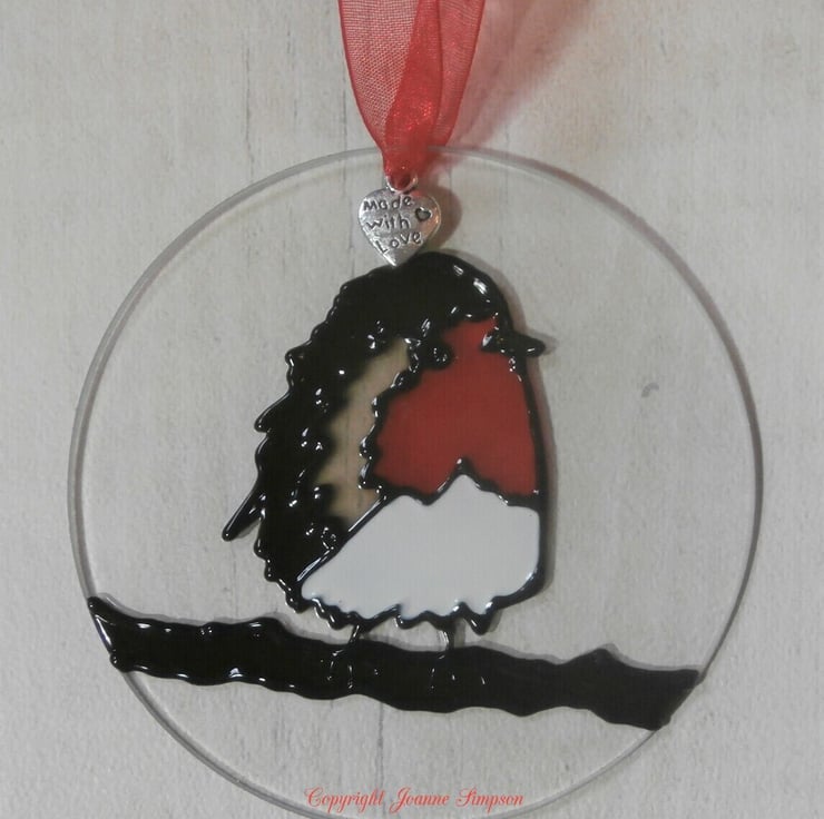 Hand painted glass sun catcher with my own Robin design. Finished with a 'made with love' charm and a beautiful red organza ribbon. Remember someone special in your life this Christmas. A special memory. Loved one memorial. Never forgotten. Hanging memorial gift. In memory of. Loved one gift. Remembrance gift.