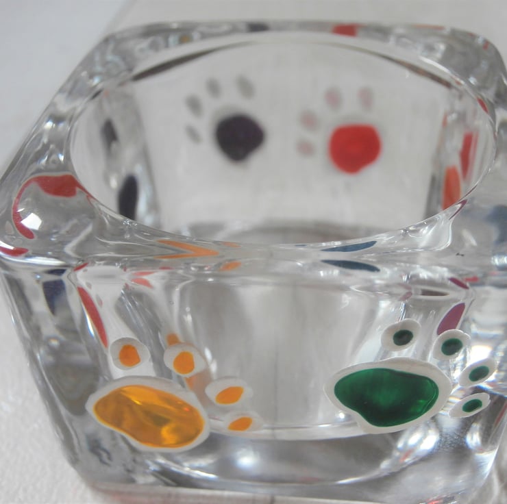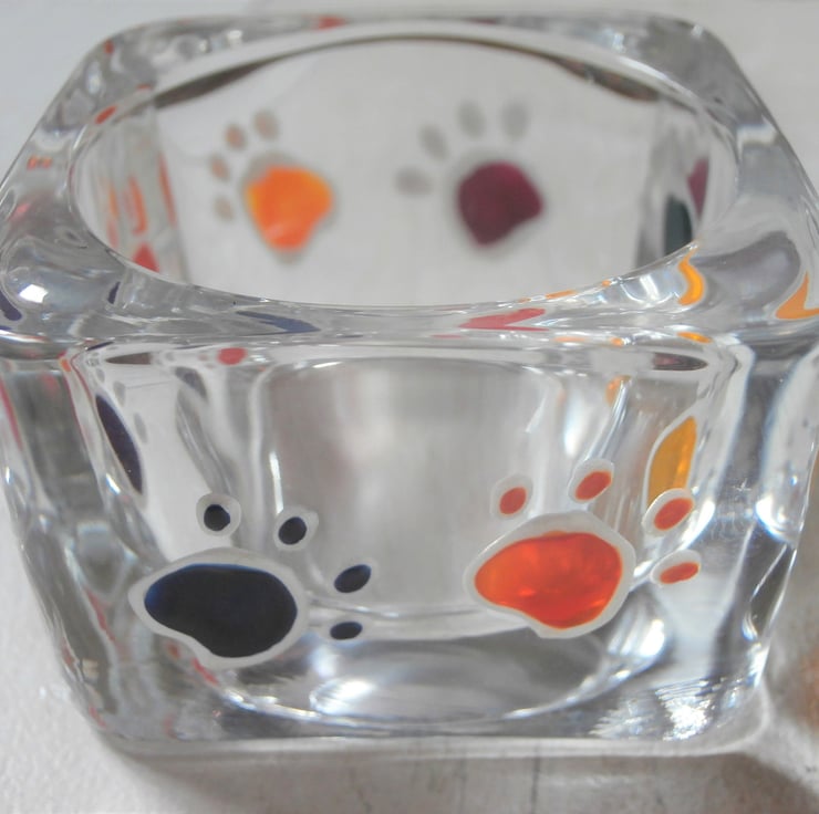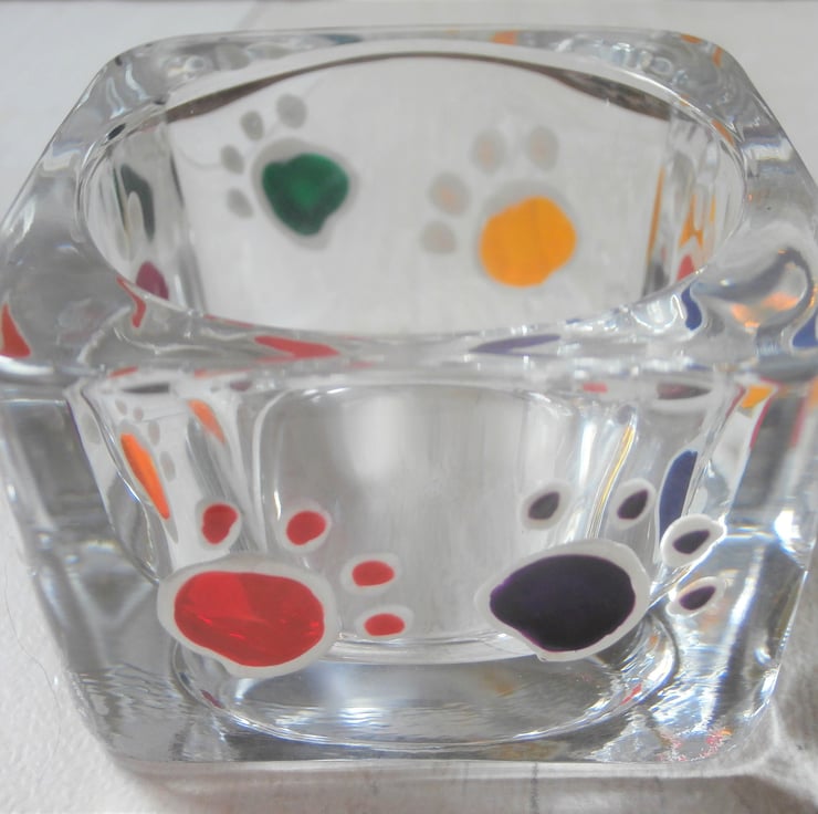Hand painted glass tealight holder with my 'Rainbow paw print' design. Multi coloured paw prints go around the edge of the holder, outlined in pearl.