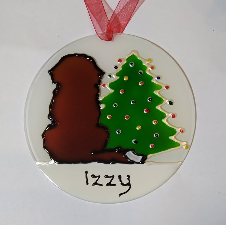 A beautiful St. Bernese dog sits near a Christmas tree. The back of the sun catcher is painted white so it gives it a bit of a 3D effect when looking from the front. Can be personalised with upto 10 letters including spaces. Finished with a red organza ribbon.
