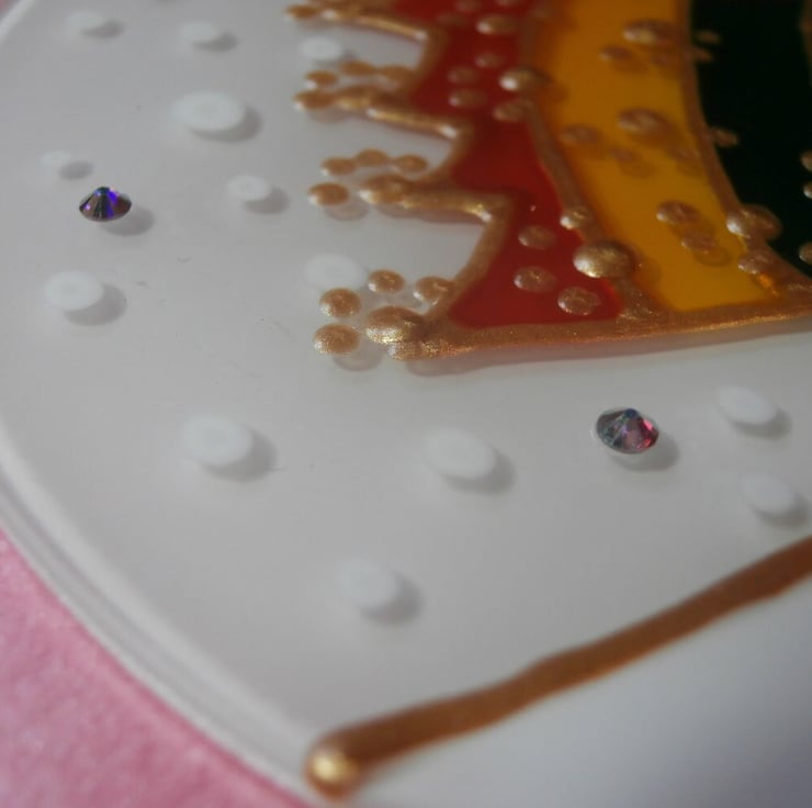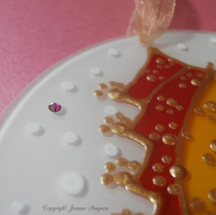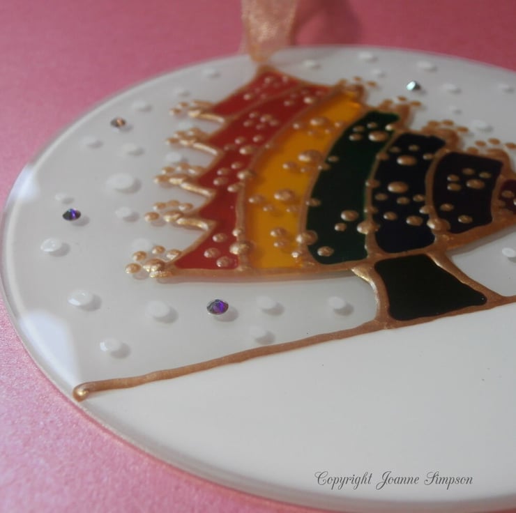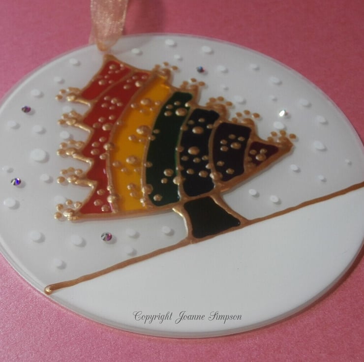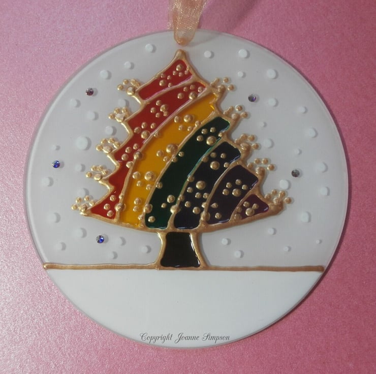 All sun catchers are hand painted by me from my own design. A colourful Rainbow Christmas tree in the snow. The back of this sun catcher is painted white so it gives a slight 3D effect when looking at it from the front. As each one is hand painted they are all as individual as your pet who has crossed Rainbow Bridge. The paw prints on the Christmas tree are gold coloured and a single name, upto nine letters including spaces, can be added to the snow. Finished with some sparkly crystals that glint in the light and a lovely organza ribbon.