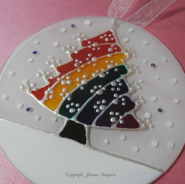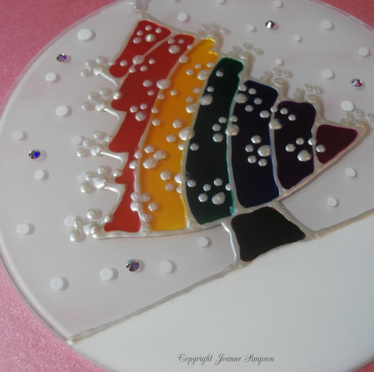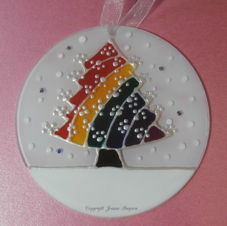 All sun catchers are hand painted by me from my own design. A colourful Rainbow Christmas tree in the snow. The back of this sun catcher is painted white so it gives a slight 3D effect when looking at it from the front. As each one is hand painted they are all as individual as your pet who has crossed Rainbow Bridge. The paw prints on the Christmas tree are pearl coloured and a single name, upto nine letters, including spaces, can be added to the snow. Finished with some sparkly crystals that glint in the light and a lovely organza ribbon.