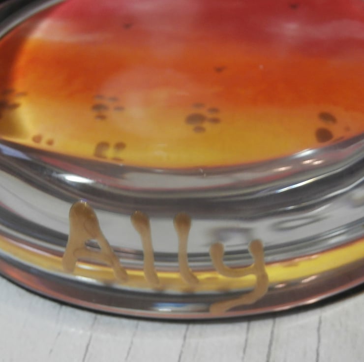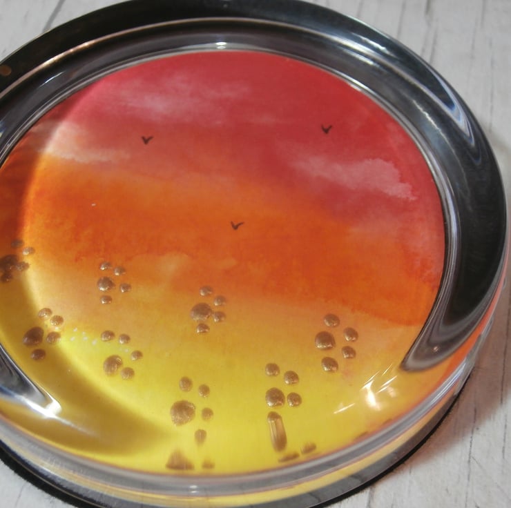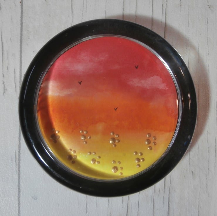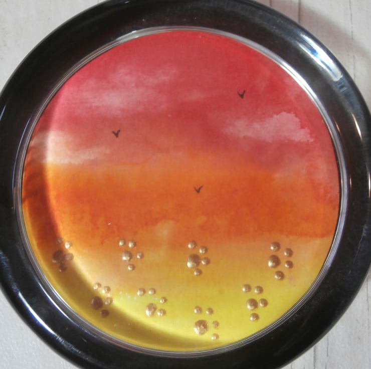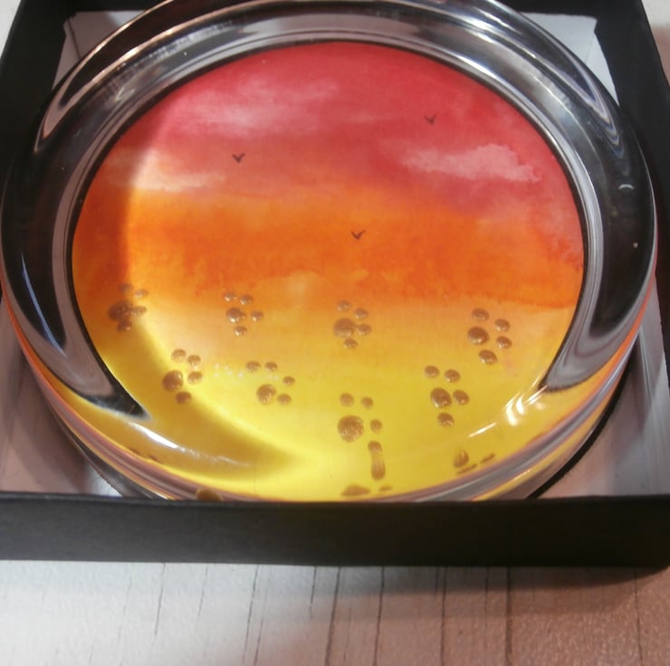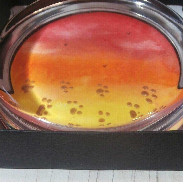 A totally unique pet memorial. A little watercolour painting sits within the recess in the base of this paperweight. The base is sealed with adhesive felt. Each of these paintings is totally unique as the paint flows where it wishes to create this beautiful sunset with gold coloured paw prints on the beach.