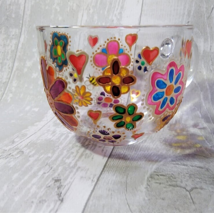 Hand painted large glass mug/cup. A perfect gift for Mother's Day, Valentines Day, Birthday, Anniversary or just to treat yourself. A lovely bright floral mug/cup which is completely unique. Decorated with an array of brightly coloured flowers, and a bee, this is a really fun mug and will brighten anyone's day. A lovely gift for someone special in your life. The paint is heat set so the mug can be used and is not just for decoration. I use glass paints that mimic a stained glass look. The paints are non toxic.